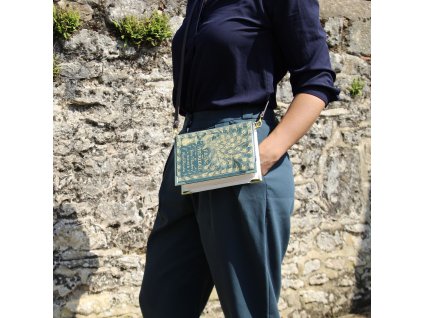 Kabelka s motivem obálky knihy Pýcha a předsudek od Jane Austin, velká v zelené barvě