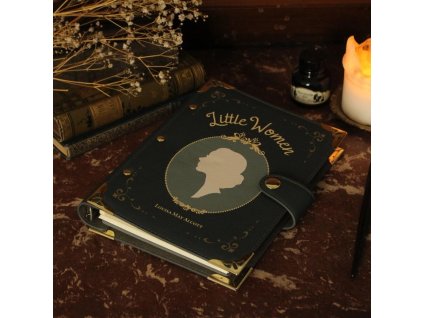 Praktický kroužkový zápisník s vyměnitelnými listy papíru s motivem románu Malé ženy od Louisy May Ascott, tmavě zelený