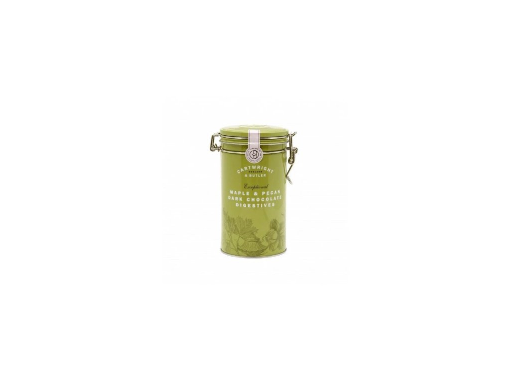 Lahodné sušenky s pekanovými ořechy a javorovým sirupem polité hořkou čokoládou. Balené v plechové dóze, ideální k oblíbenému čaji, kávě nebo jako dárek pro Vaše blízké a přátele.