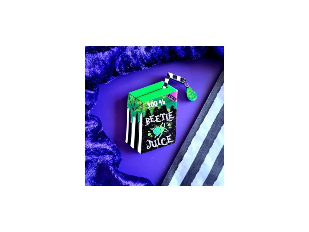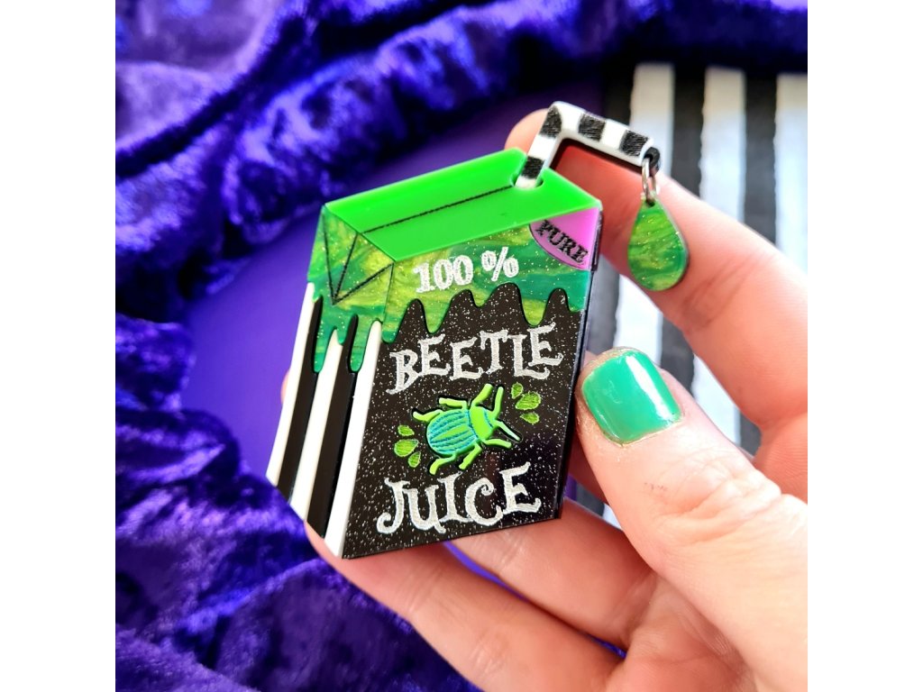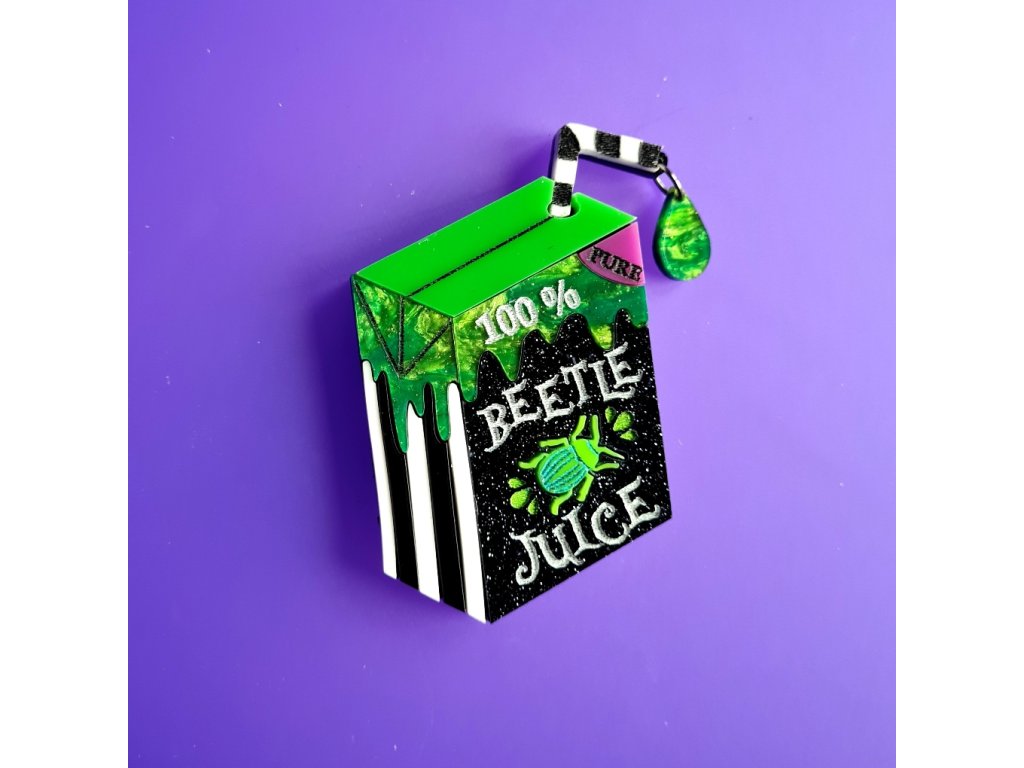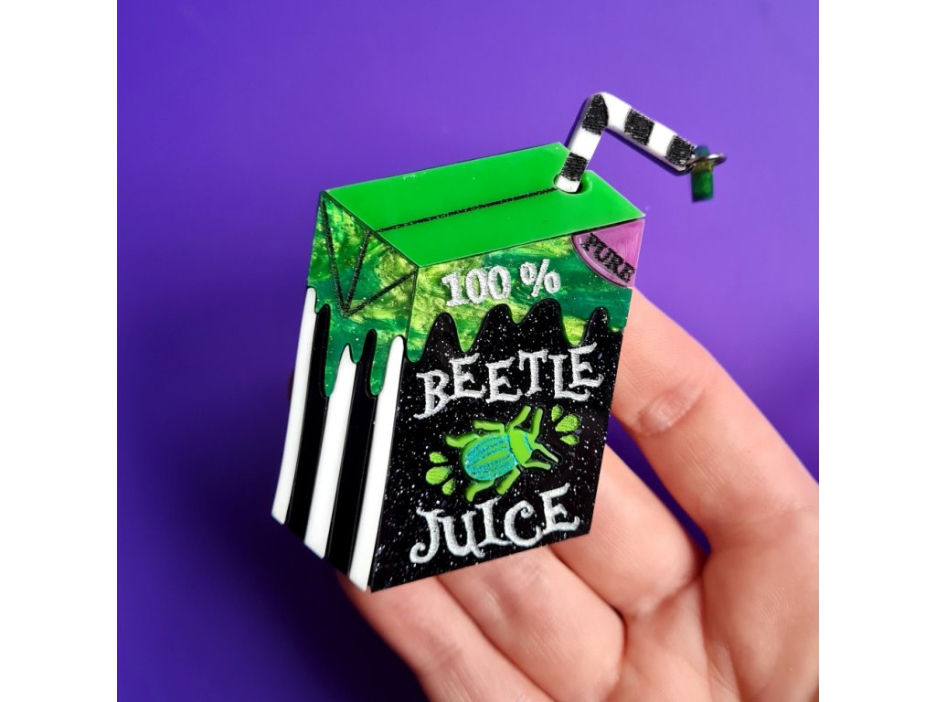 Brož Inspirovaná nápojem Beetle Juice je vyrobena ze dvou vrstev lesklého, mramorového akrylu s vyrytými a ručně malovanými detaily. Na brčku visí zelená kapka juice, která šperk oživuje dodává mu hravý nádech. Šperk měří 7 cm. Zapínání na klasický, brožový můstek s bezpečnostní pojistkou vyrobený z nerezové oceli.