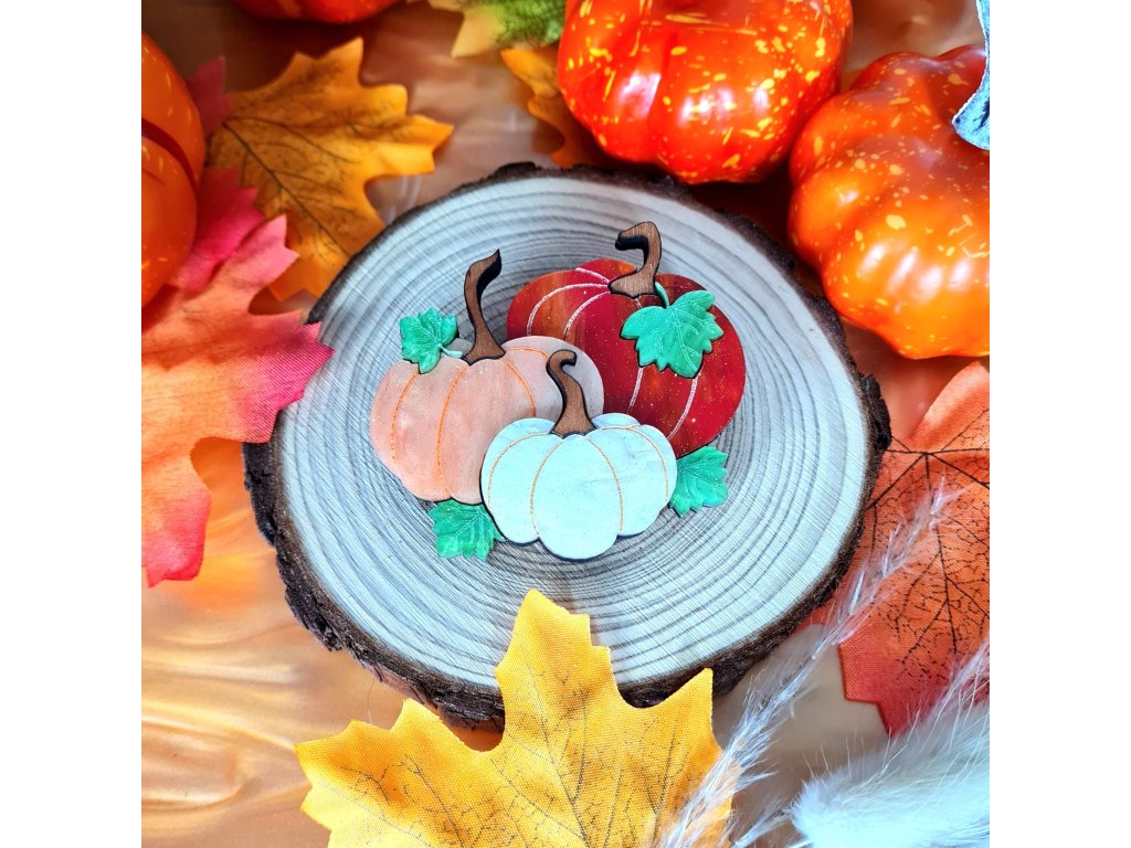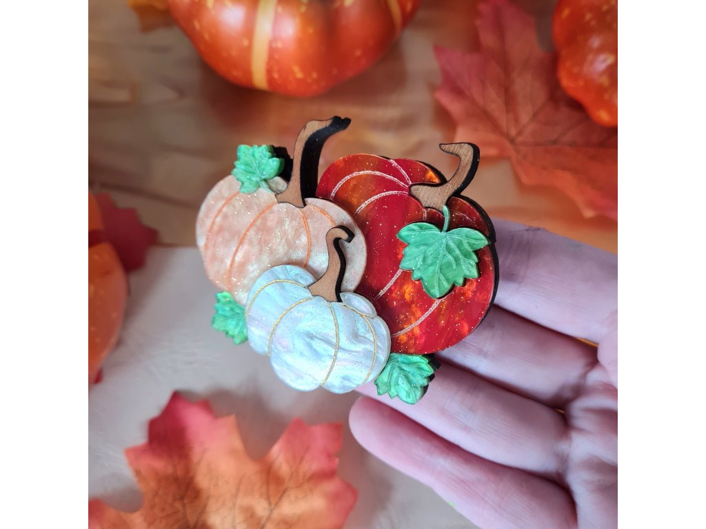 Trojice dýní je tvořena z akrylové pryskyřice v několika barevných odstínech od lesklé krémové přes světle oranžovou až po tmavě oranžovou. Pro větší hloubku jsou vrstvy postupně nanášeny a doplněny pečlivě ručně rytými detaily. Šířka je 6,5 cm, brož s bezpečnostním zapínáním.