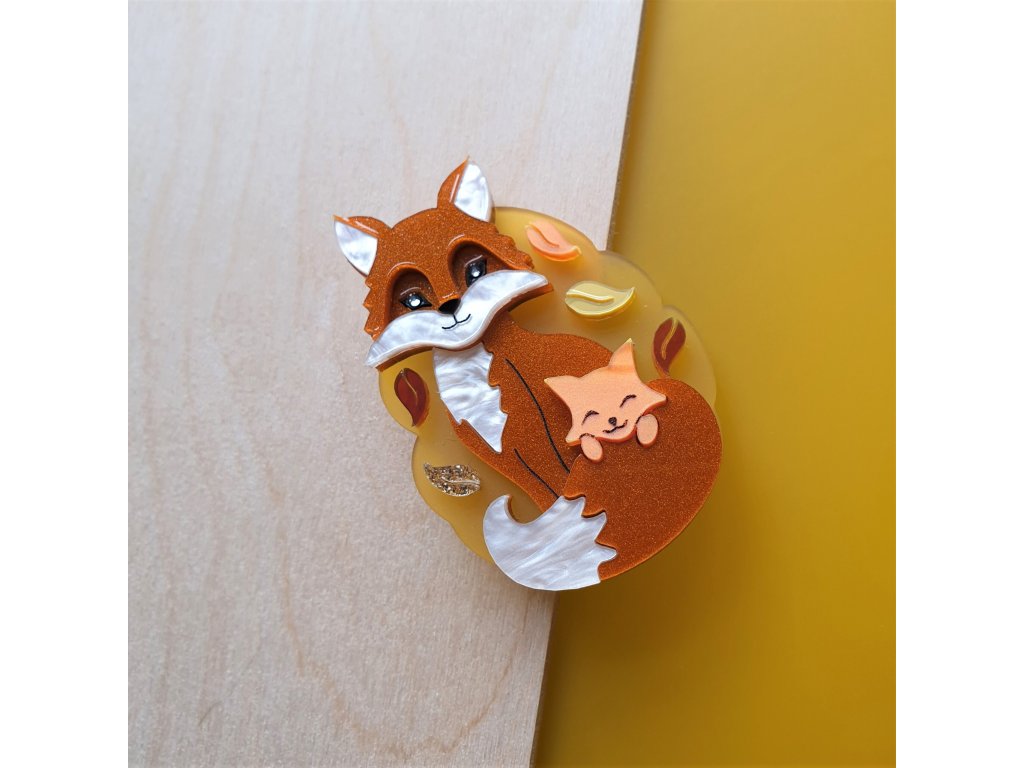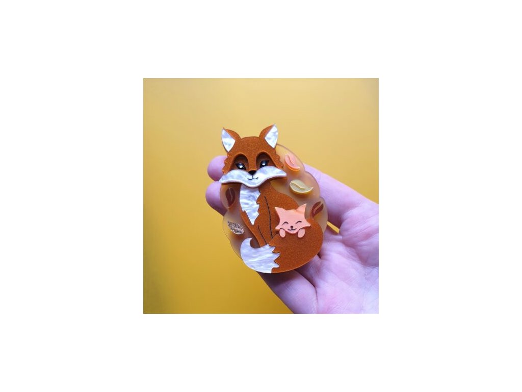 Brož je složitě vyřezána ze tří vrstev lesklé, matné a mromorované akrylové pryskyřice se třpytkami. Je vrstvená, což dodává šperku hloubku. Ryté detaily jsou ručně barvené a oči jsou z lesklých krystalů Swarovski. Brož měří 7 cm na délku, je vybavena zapínáním s pojistkou.