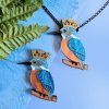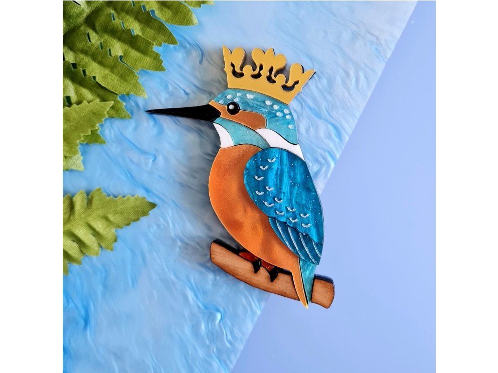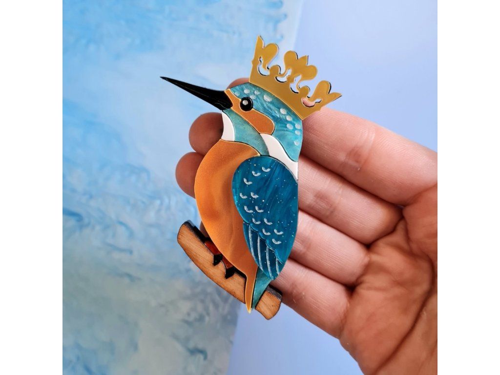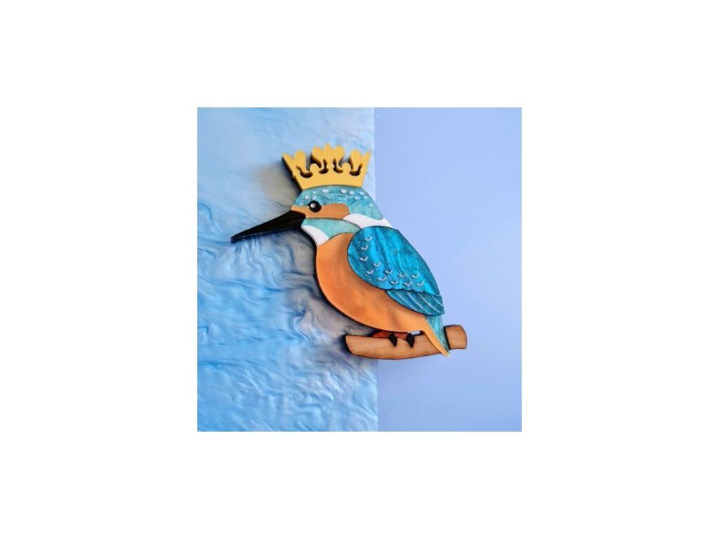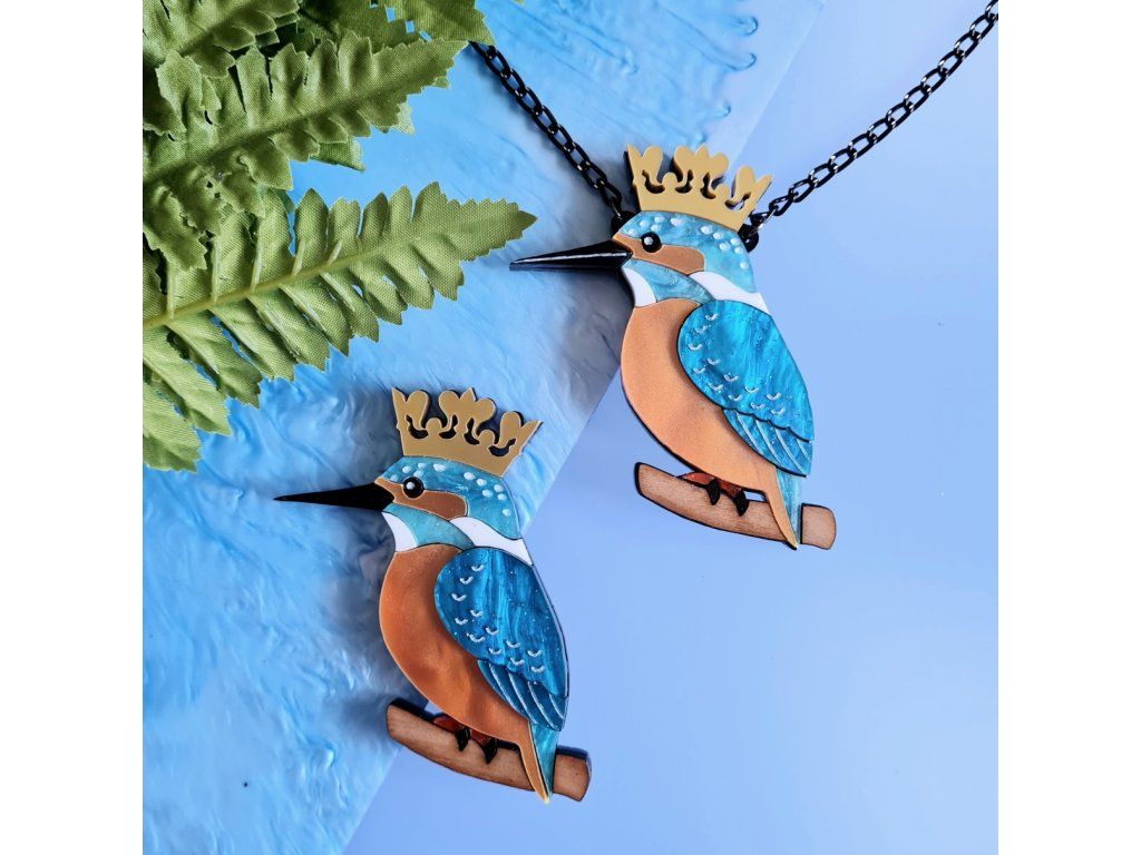 Motiv ledňáčka je vyroben ze tří jemných vrstev lesklého, mramorovaného a metalického akrylu s ručně malovanými detaily. Sedí na laserem vyřezané větvi z třešňového dřeva. Výška je 7 cm. Vybrat si můžete brož nebo náhrdelník. Brož je připevněna k zapínání z nerezové oceli s bezpečnostní pojistkou a náhrdelník visí na 45 cm dlouhém, černém řetízku.