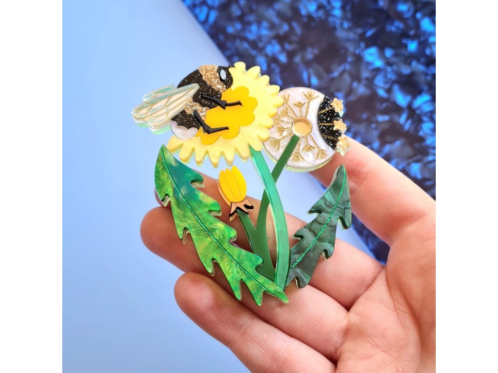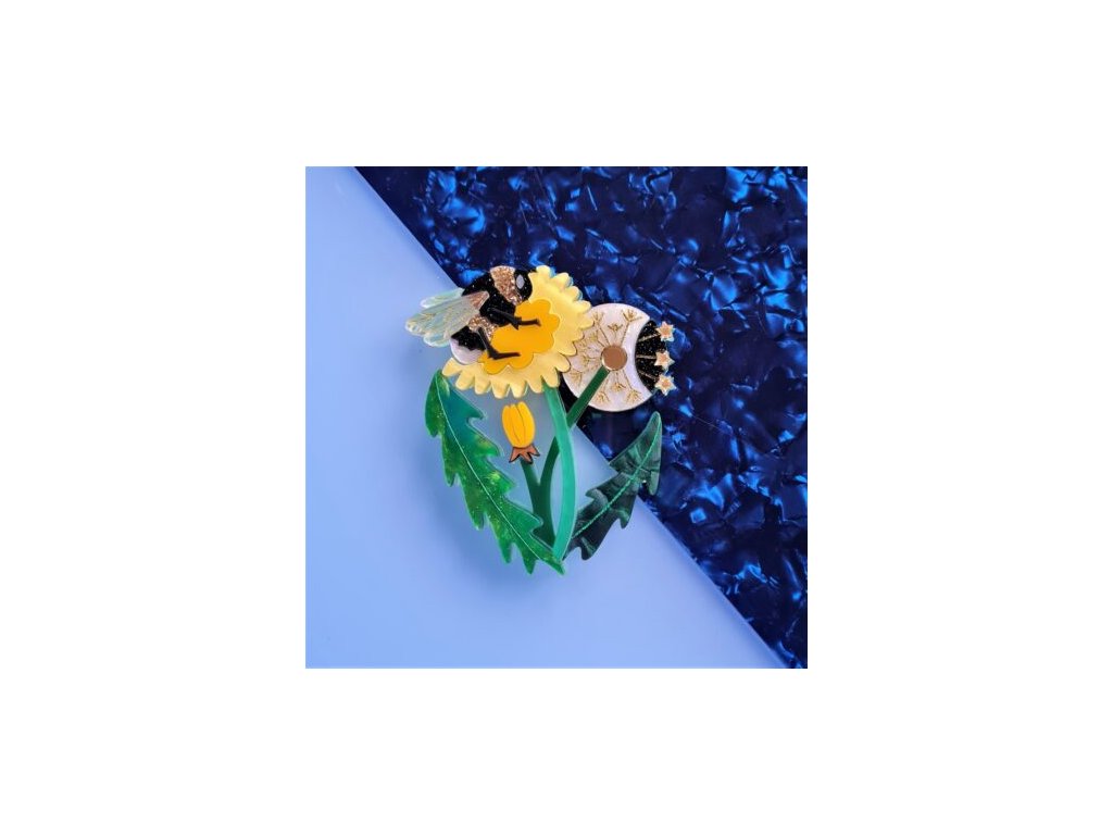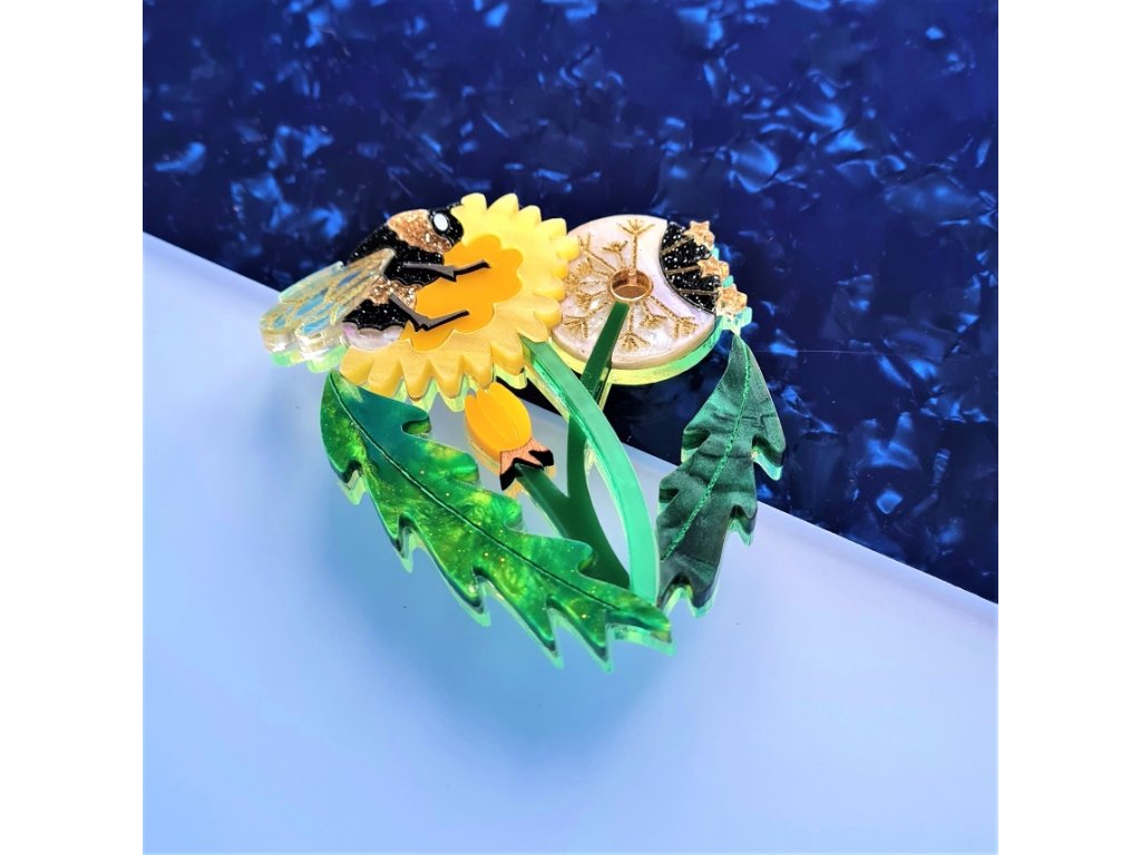 Koncept tohoto návrhu zachycuje tři fáze vývoje květu pampelišky, které představují slunce, měsíc a hvězdy. Žlutý květ je slunce, bílá semenná hlávka je měsíc a rozptýlená semena jsou hvězdy. Použity jsou akrylové pryskyřice v kontrastních odstínech zelené barvy na listech a stoncích ve třech vrstvách, noční prvky jsou v jedné vrstvě a denní prvky v další vrstvě, což dodává šperku hloubku. Květy se zavírají za soumraku, takže malý pupen je součástí noční vrstvy. Do návrhu jsem také zahrnuta veselá, chlupatá včelku, protože včely milují pampelišky a jsou nezbytné pro Zemi a život.