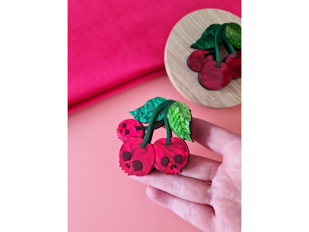 Tento design znázorňuje třešňovou větvičku s detaily lebky. Je vrstvený, aby dodal detailům hloubku, a je vyroben z lesklé a mramorové akrylové pryskyřice se třpytkami, na částí listů jsou ručně ryté detaily. Měří 6 cm na šířku a 6,5 cm na výšku. Zapínání na klasický, brožový můstek s bezpečnostní pojistkou vyrobený z nerezové oceli.