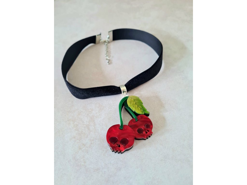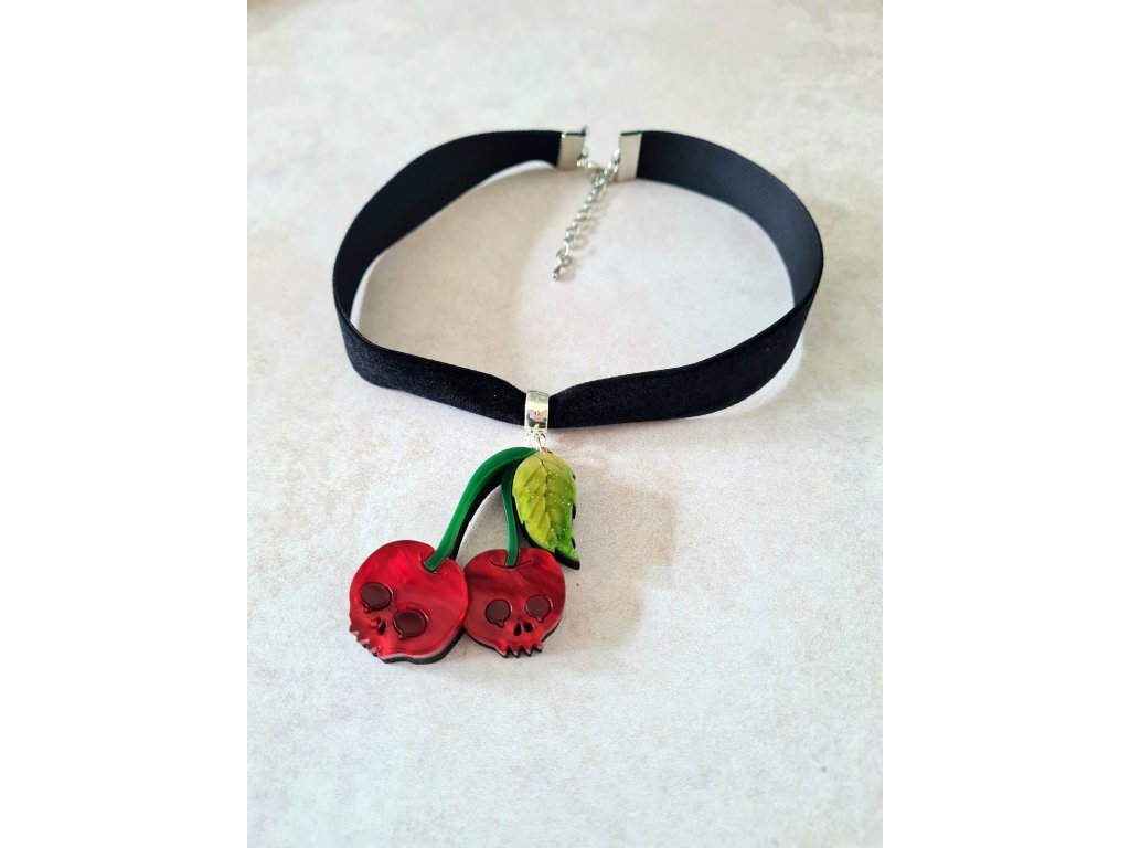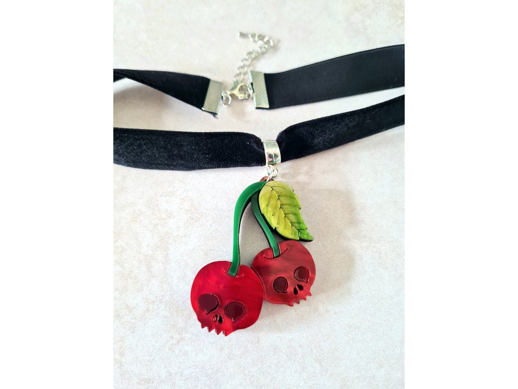Sametový náhrdelníky typu choker s přívěskem ve tvaru páru třešňových lebek vyrobených z akrylové pryskyřice zářivých barev se třpytkami oživí Váš outfit. Třešně jsou dlouhé 5 cm a zavěšené na luxusním černém, sametovém, ručně vyrobeném náhrdelníku typu choker. Náhrdelník je dlouhý 31 cm a má prodlužovací řetízek pro individuální nastavení délky.