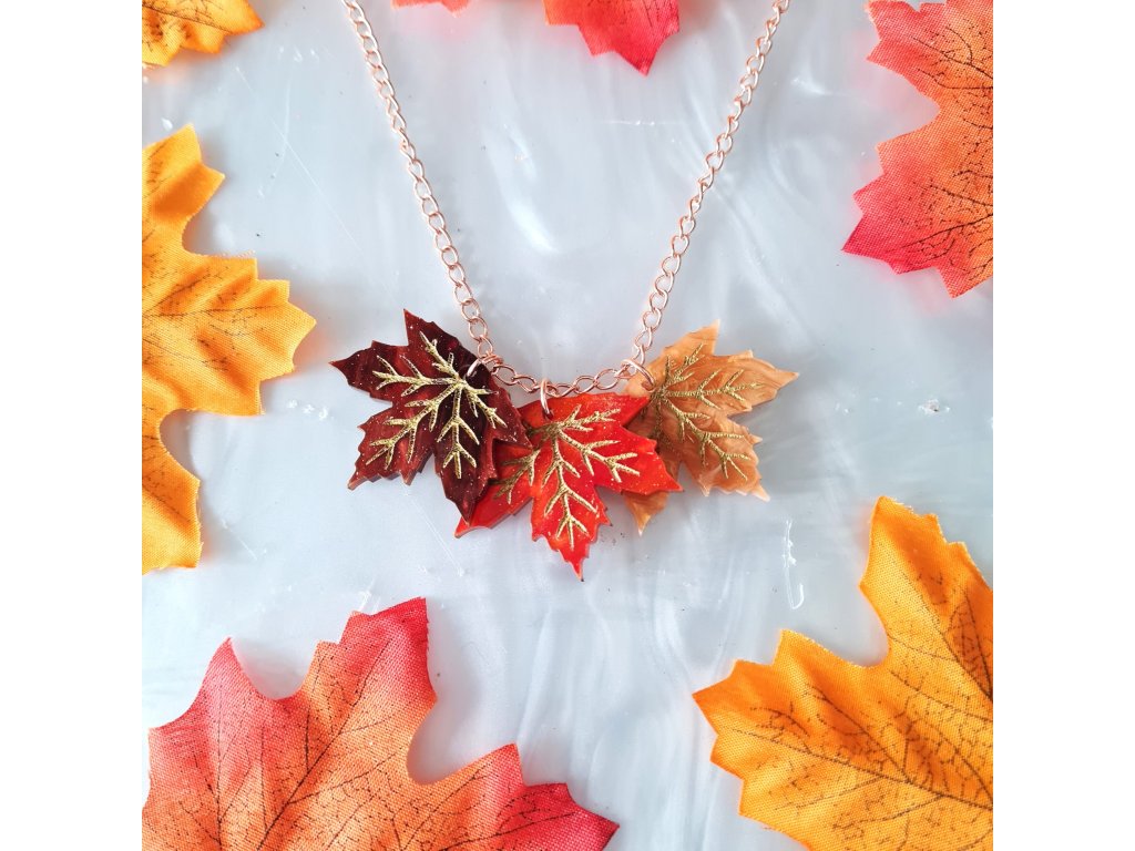 Krásný, podzimní náhrdelník se třemi javorovými listy v odstupňovaných, barevných tónech. Každý list je zavěšen samostatně na řetízku v barvě růžového zlata a má rozměr 6 cm.