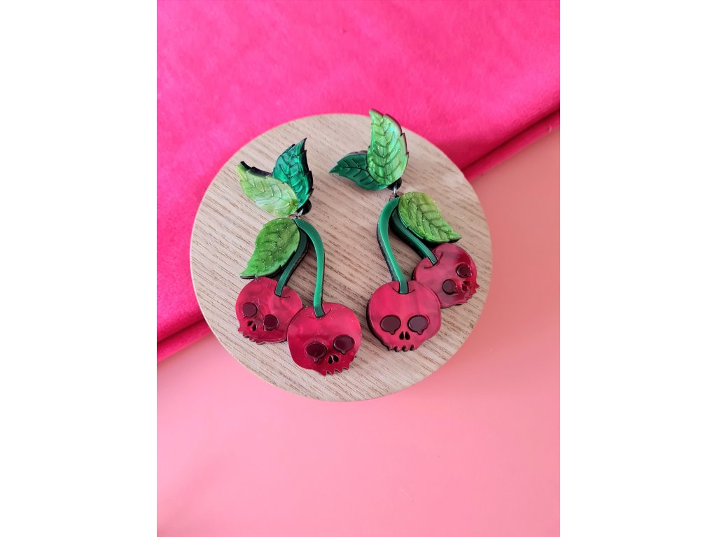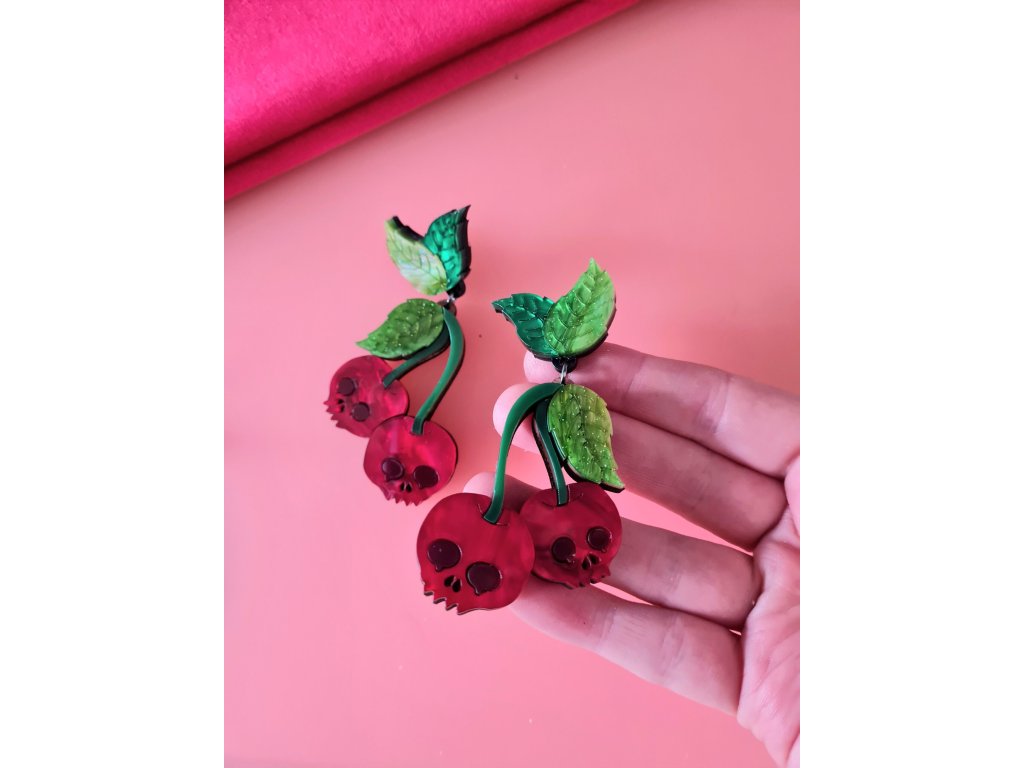 Výrazné náušnice s motivem lebky a třešní. Tyto náušnice jsou dlouhé 5 cm a jsou vyrobeny z lesklé a mramorové akrylové pryskyřice, s vyrytými detaily listů a vrstvením pro větší hloubku. Jsou zavěšeny na malých lístcích.