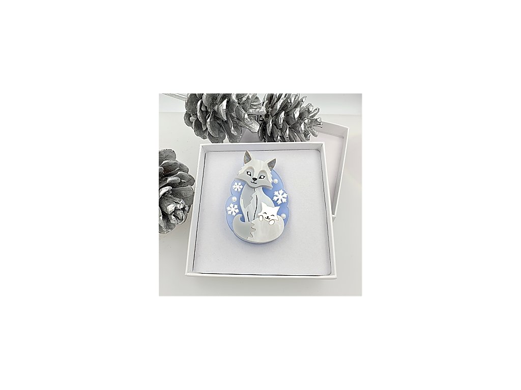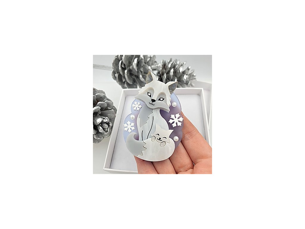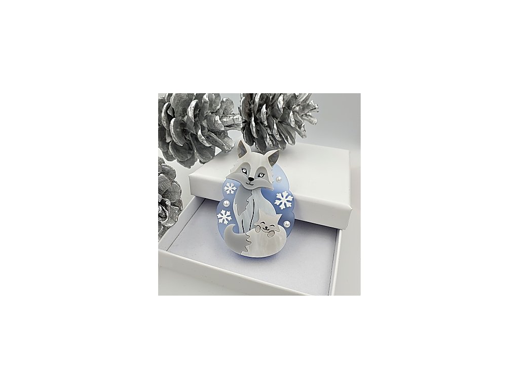 Brož je složitě vyřezána ze tří vrstev akrylu s efektem mrazu, lesku a mramoru. Je ručně vrstvená, což dodává šperku hloubku. Vyryté části jsou ručně barvené a oči jsou z pravých krystalů Swarovski. Akrylové bílé sněhové vločky a perleťové kabošony Swarovski dodávají dílu zimní nádech.