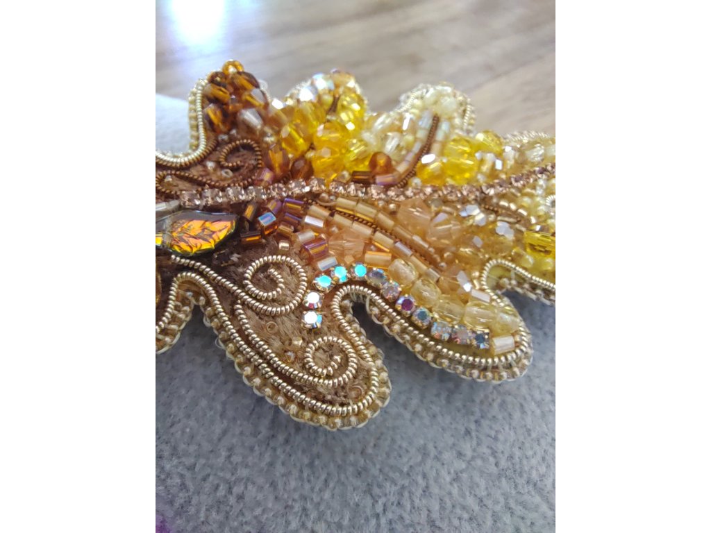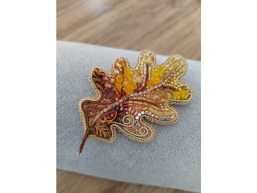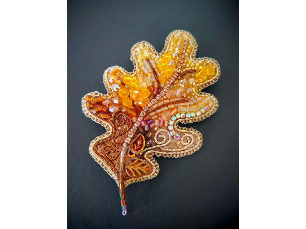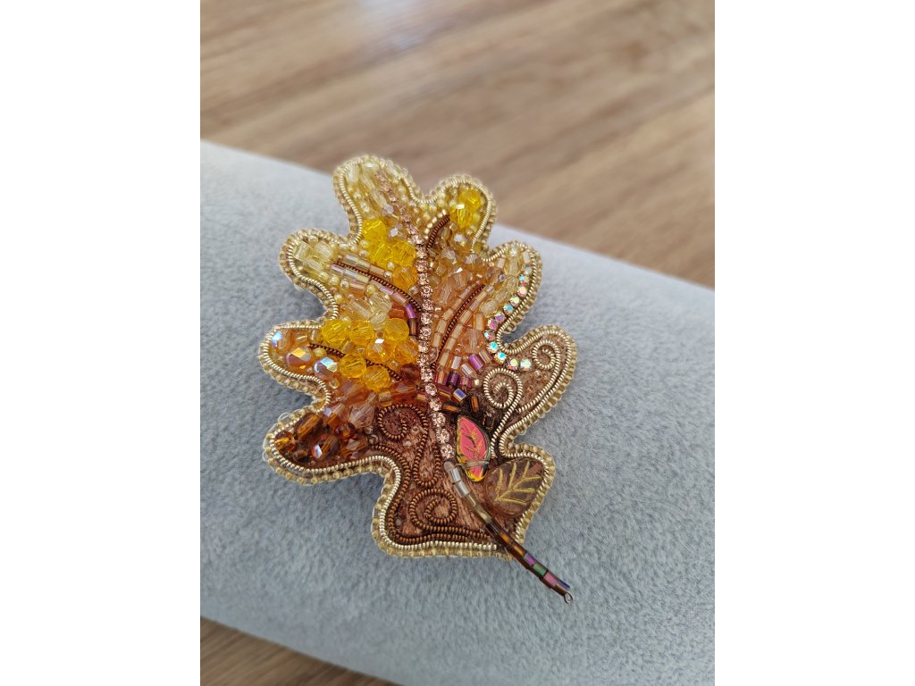 Brož inspirována dubovým listem, poslem dubových hájů, které byly považovány za posvátná místa. Dle legend zde bylo možné získat rady a moudrost. Lidé ve stínu mohutných dubů odpočívali a věřili, že ve snu dostanou důležité rady. Pojďte se zasnít s nádhernou broží o rozměrech 9 cm délka x 7cm šířka v nejširším místě. Zapínání s bezpečnostní pojistkou vyrobené z nerezové oceli. Brož je celá ručně šitá ze skleněných korálků.