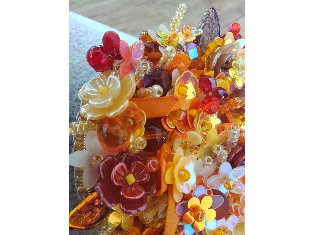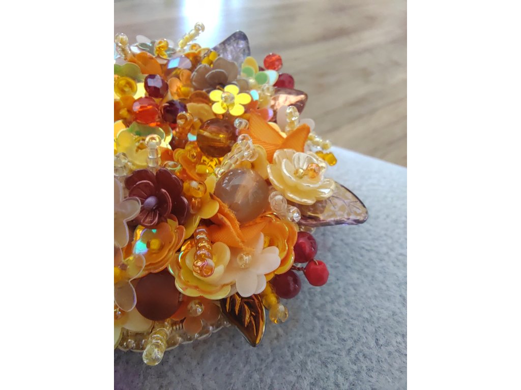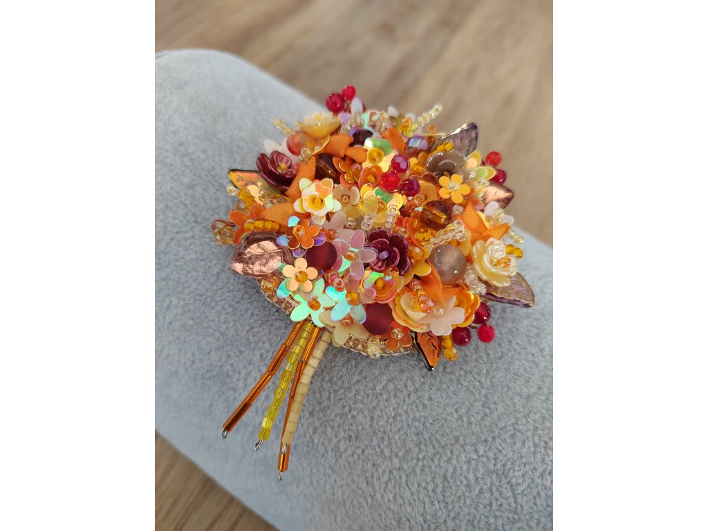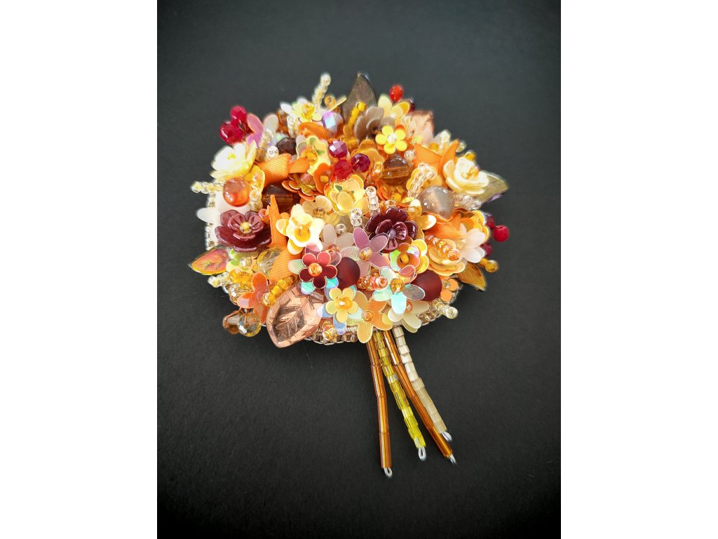 Brož inspirovaná posledními květy aster, chryzantém, rozchodníků, sytě žlutých rudbékií dalších podzimních krásek. Rozměry šperku jsou 8,5 cm výška x 6,5 cm šířka v nejširším místě kytice. Zapínání s bezpečnostní pojistkou vyrobené z nerezové oceli. Brož je celá ručně šitá ze skleněných korálků.