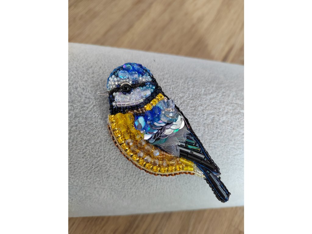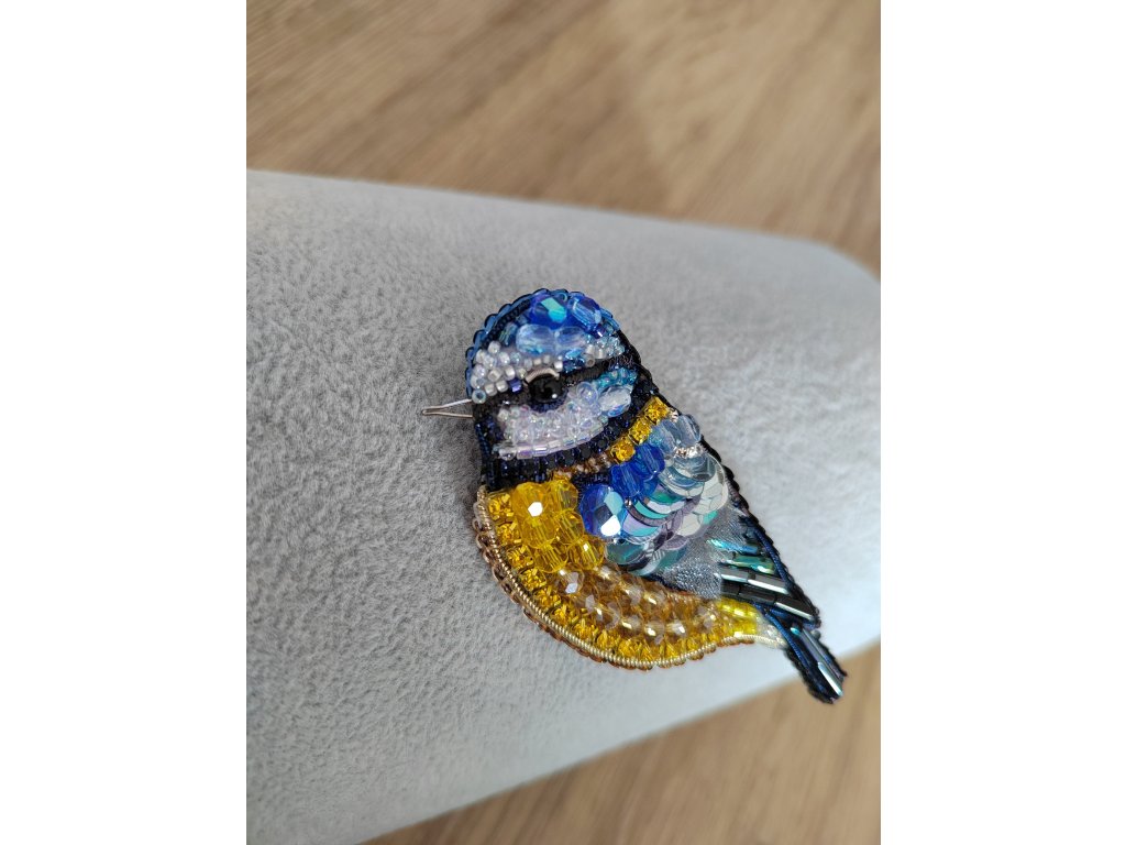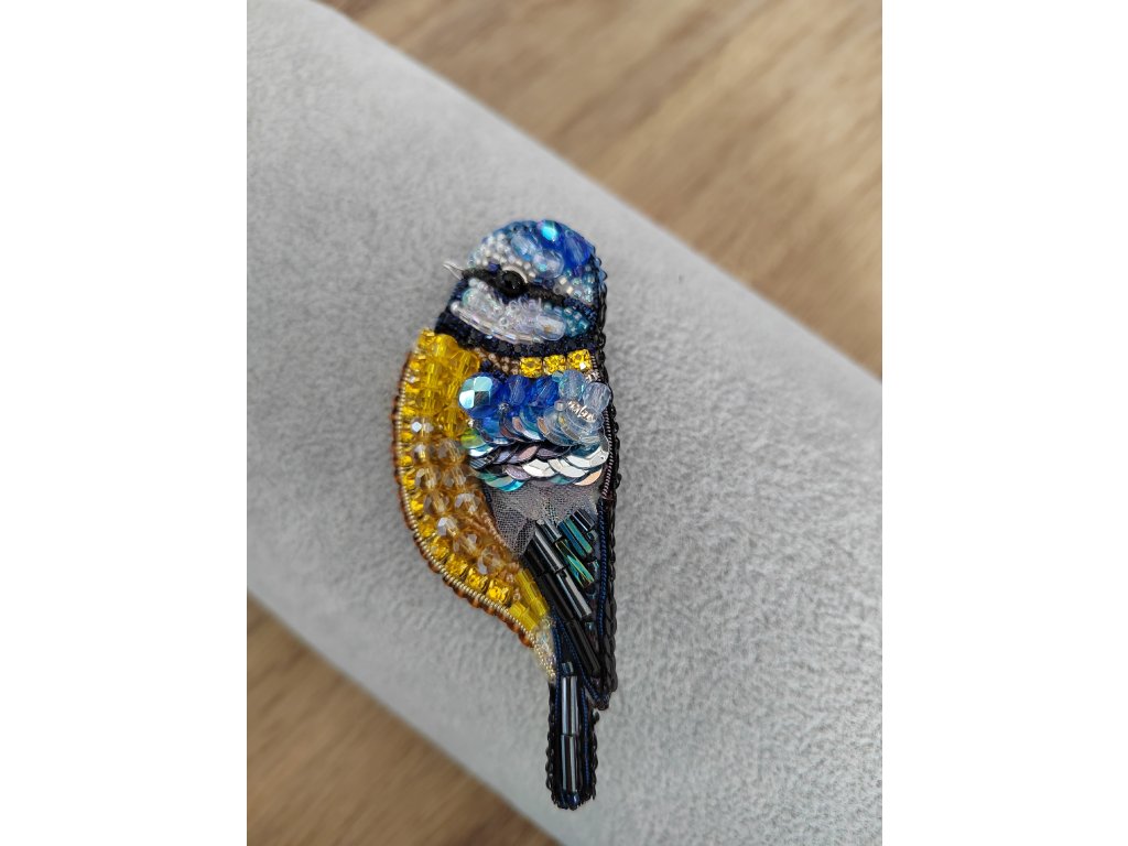 Ručně šitá, originální brož z korálků Sýkorka