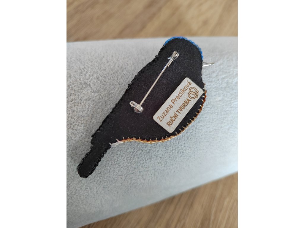 Brož je inspirována právě tímto malým, ale velmi odolným, houževnatým a chytrým ptáčkem, který si dokáže poradit a přežít i v tuhé zimě. Rozměry šperku jsou 6 cm délka x 3 cm šířka v nejširším místě těla. Zapínání s bezpečnostní pojistkou vyrobené z nerezové oceli. Brož je celá ručně šitá ze skleněných korálků.
