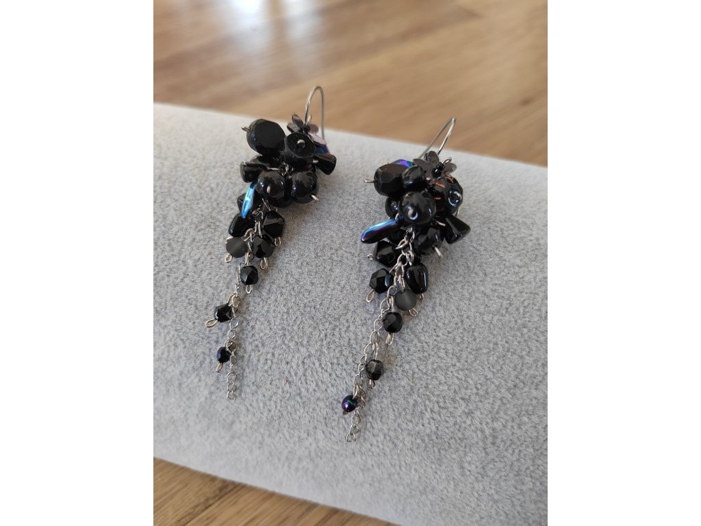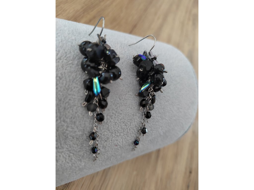 Ručně vyráběné náušnice v klasické, černé barvě. Náušnice jsou vyrobeny ze skleněných korálků a kovových komponentů z nerezové oceli. Závěs náušnic je v boltci ucha zajištěn silikonovou pojistkou.