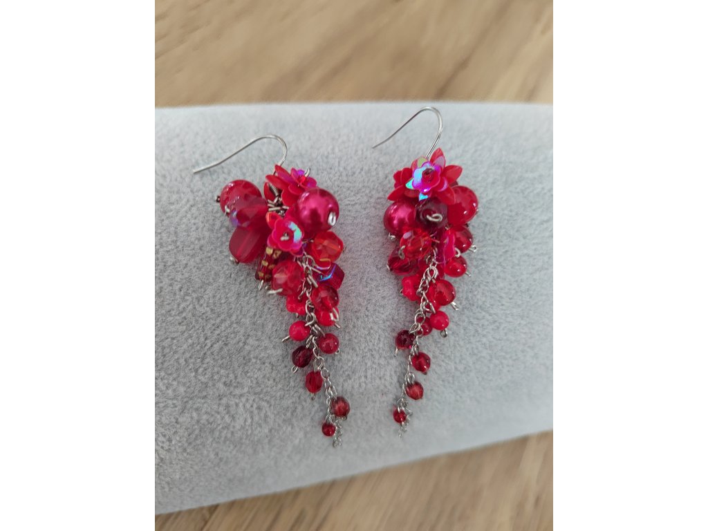 Ručně vyráběné náušnice v nádherných odstínech červené. Náušnice jsou vyrobeny ze skleněných korálků a kovových komponentů z nerezové oceli. Závěs náušnic je v boltci ucha zajištěn silikonovou pojistkou.
