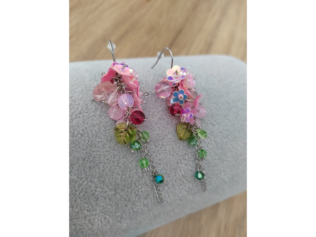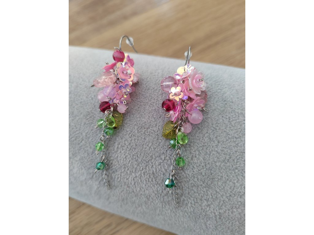 Ručně vyráběné náušnice v nádherných, jemných odstínech světle zelené a růžové. Náušnice jsou vyrobeny ze skleněných korálků a kovových komponentů z nerezové oceli. Závěs náušnic je v boltci ucha zajištěn silikonovou pojistkou.