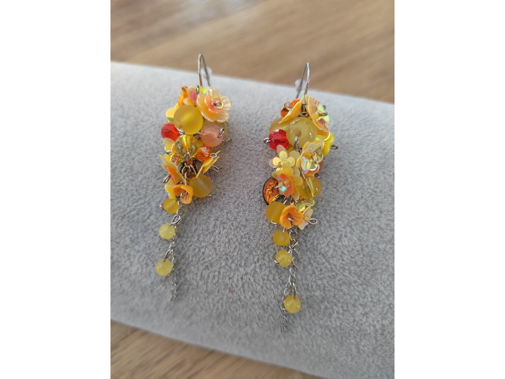 Ručně vyráběné náušnice v nádherných odstínech žluté. Náušnice jsou vyrobeny ze skleněných korálků a kovových komponentů z nerezové oceli. Závěs náušnic je v boltci ucha zajištěn silikonovou pojistkou.