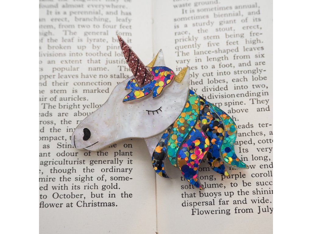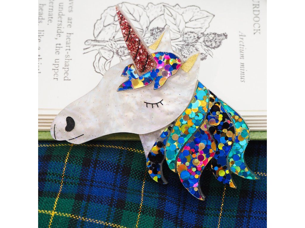Tato okouzlující brož oživuje mýtického jednorožce díky oslnivé kombinaci akrylových materiálů. Tělo je vyrobeno z akrylu Marble Sparkle White, který mu dodává éterický, třpytivý vzhled, zatímco hříva se leskne zářivými akrylovými barvami třpytivých konfet. Krásný růžový roh s glitry dodává broži finální nádech magie a činí z ní fantazijní doplněk pro každého, kdo miluje žánr fantasy.
