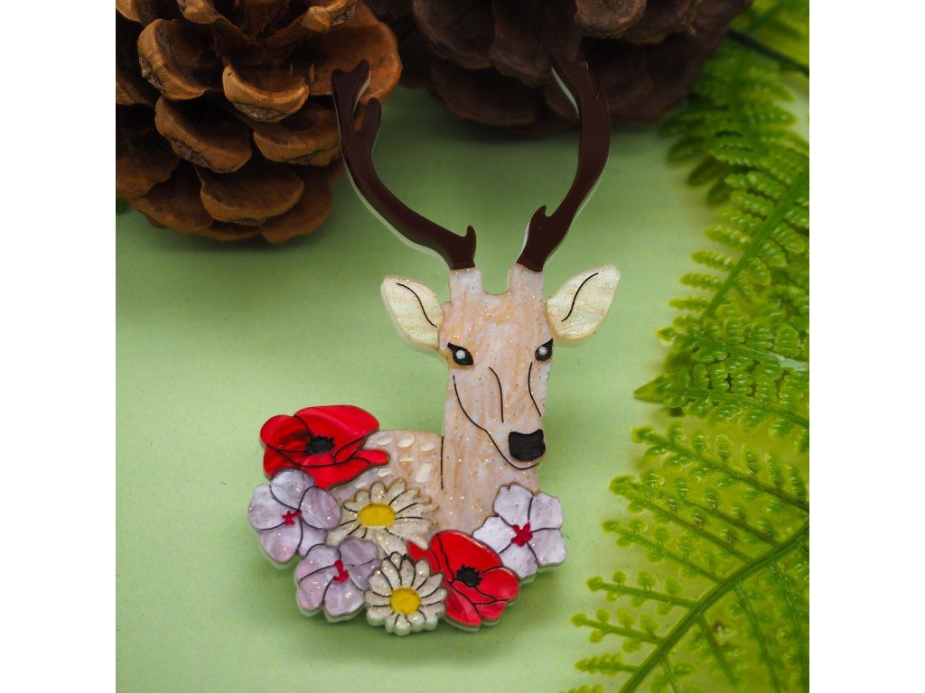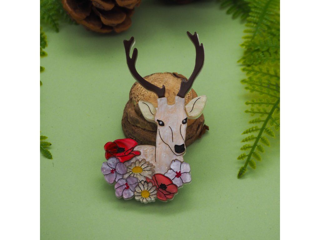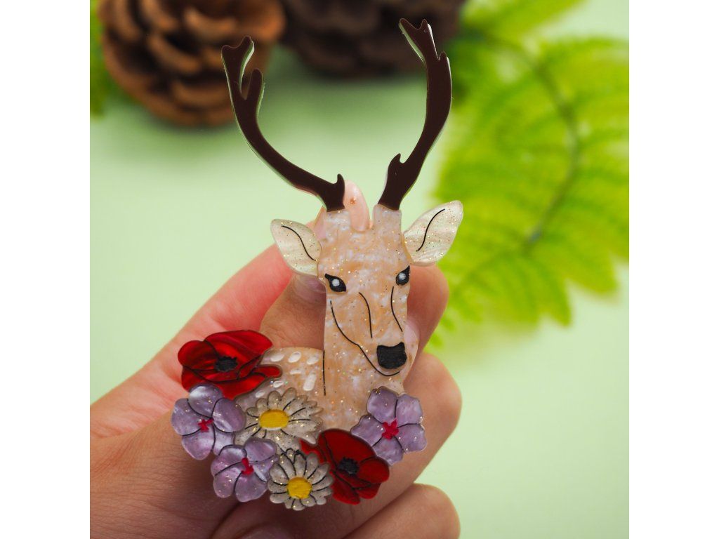 Brož „Jelen mezi divokými květinami“ je elegantní a okouzlující a zachycuje majestátního jelena, který se právě vynořuje z rozkvetlé louky. Jelena obklopuje směs muškátů, červených máků a sedmikrásky, přičemž každá květina je vyrobena z různých akrylových materiálů s propracovanými ručně malovanými detaily, které podtrhují jemnou krásu a barvu každého květu. Srst jelena se leskne zlatým akrylovým leskem, který dodává živoucí dojem, zatímco pečlivé ručně malované akcenty dodávají hloubku a osobnost jelenovým očím a rysům. Tato brož je ideální pro milovníky přírody, snílky a všechny, kteří jsou okouzleni divokou elegancí lesního života.