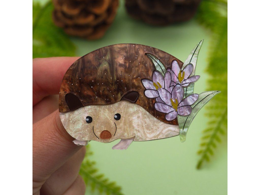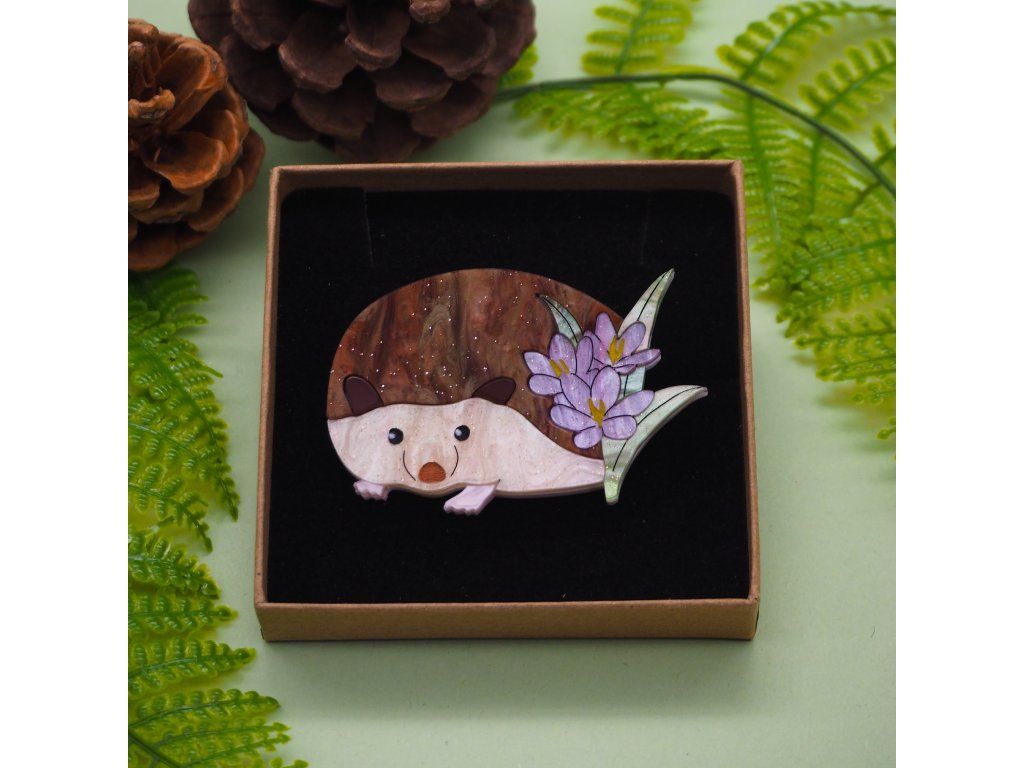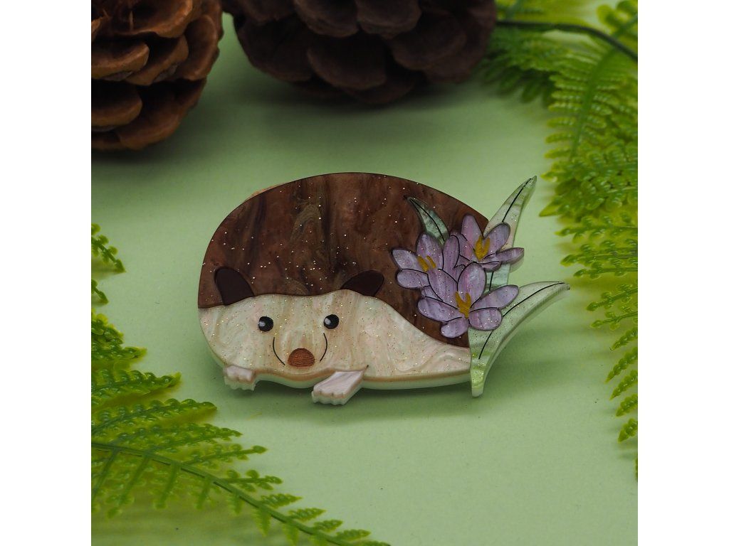 Ježek je vyroben z hnědého akrylu s třpytivým efektem, který jeho bodlinkám dodává teplou, lesklou texturu, zatímco krokusy se třpytí fialovým akrylem s jiskřivým efektem, jsou doplněny ručně malovanými žlutými tyčinkami, které jim dodávají realistický detail. Ručně malované rysy ve tváři ježka dodávají tomuto rozkošnému kousku osobnost a šarm.
