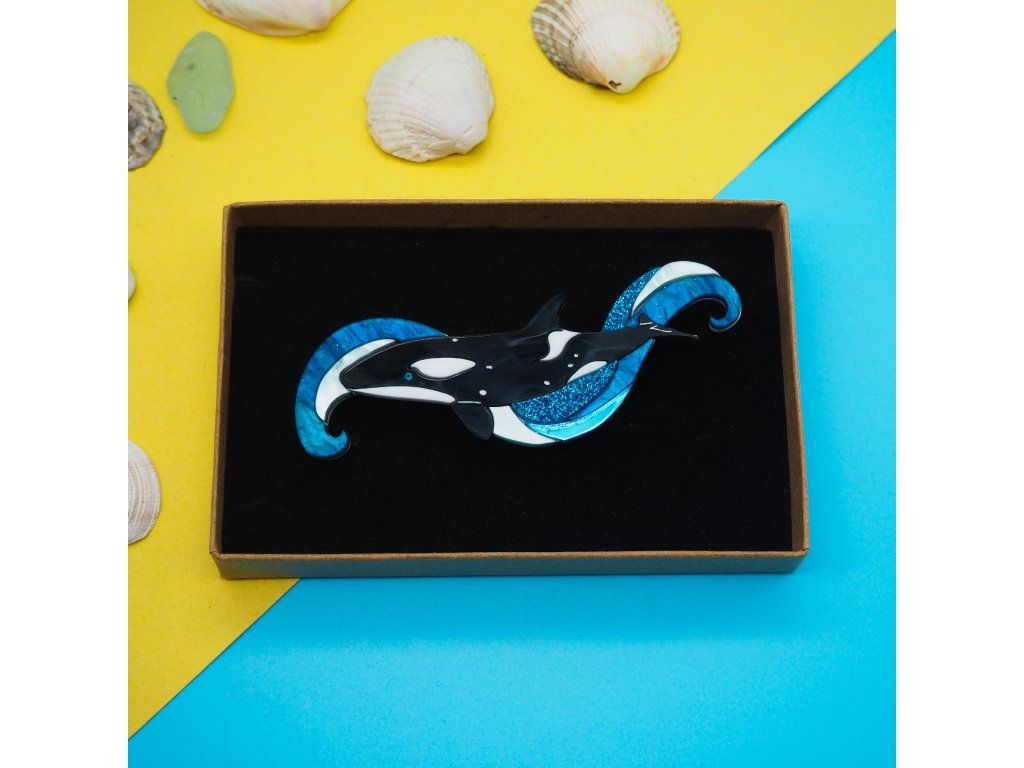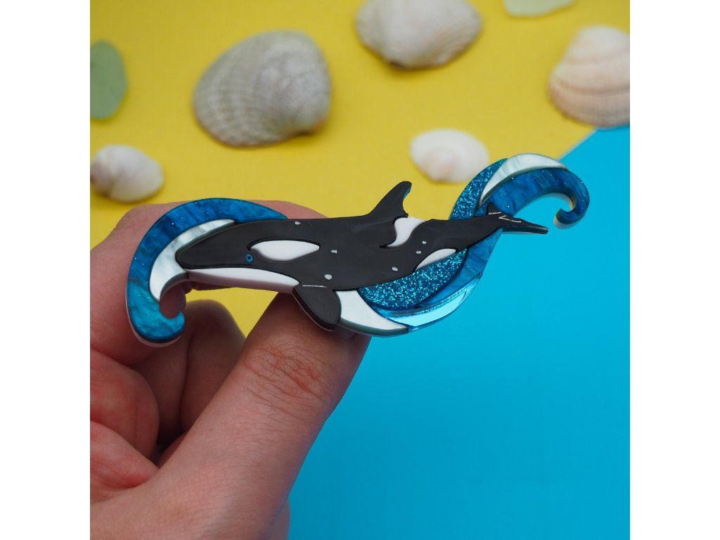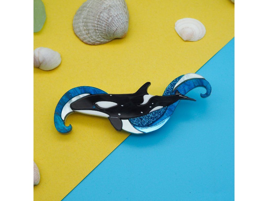 Ponořte se do hlubin s touto působivou broží, majestátní kosatka ladně klouzající vířícími vlnami.