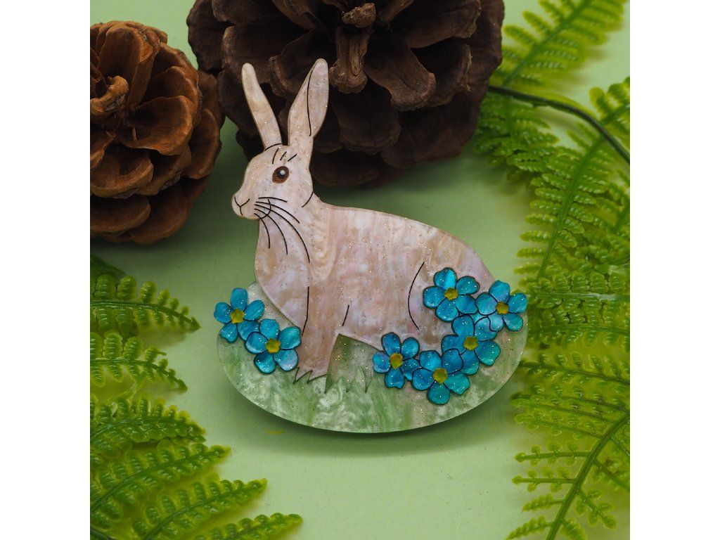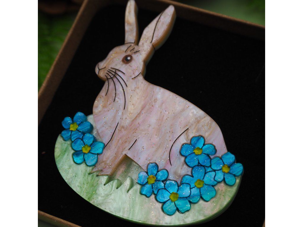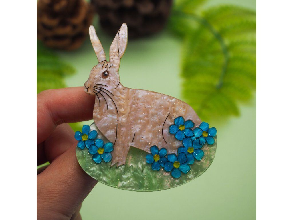 Brož zachycuje klidný okamžik na louce. Ve středu louky sedí zajíc, jeho srst ožívá díky krásnému, béžovému akrylu s třpytivým, mramorovaným povrchem, který se při každém pohybu jemně leskne. Zajíc je zasazený do třpytivé, jablkově zelené trávy, obklopen jemnými, modrými pomněnkami se třpytkami, jejichž ručně malovaná žlutá středy připomínají kapky slunečního světla. Tento kousek měří 6,5 x 7,4 cm a je dodáván v krabičce. Zapínaní na sponu z nerezové oceli s pojistkou. Každý detail je pečlivě promyšlen, od jemných rytých vzorů na srsti zajíce až po malované akcenty na každém drobném kvítku. Tato brož je uměleckým dílem, které můžete nosit.