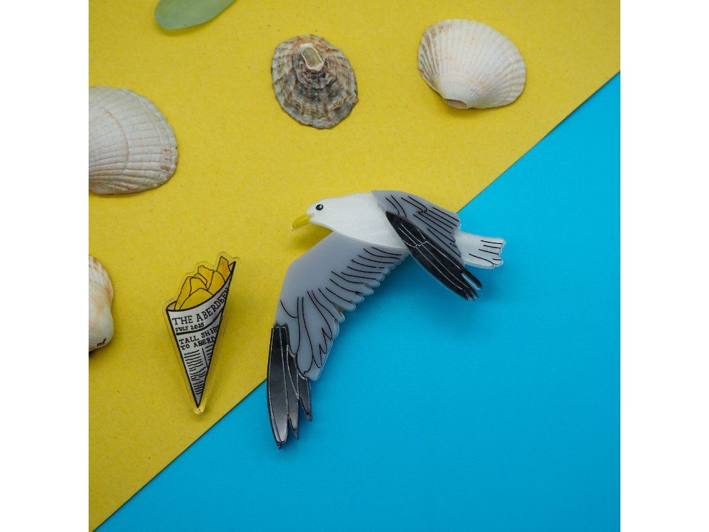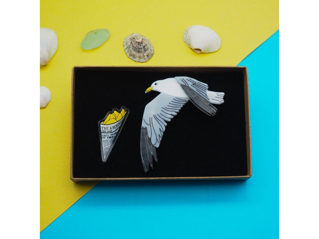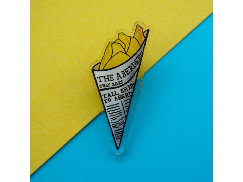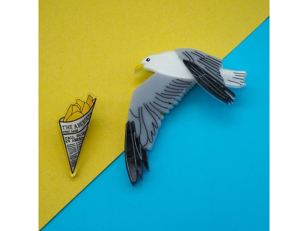 Pin kornoutu hranolků, které jsou zabalené v novinovém papíru je tištěn na akrylové pryskyřici. Dodává příjemný, nostalgický nádech starých časů, kdy novinový papír byl nejběžnějším způsobem, jak zabalit jídlo u pouličního stánku s občerstvením a pry, dle pamětníků, chutnaly hranolky s octem a solí nejlépe právě z novinového kornoutu. Společně tvoří dokonalou dvojbrož, která zachycuje hravého ducha těchto mořských ptáků, kteří kradou jídlo!