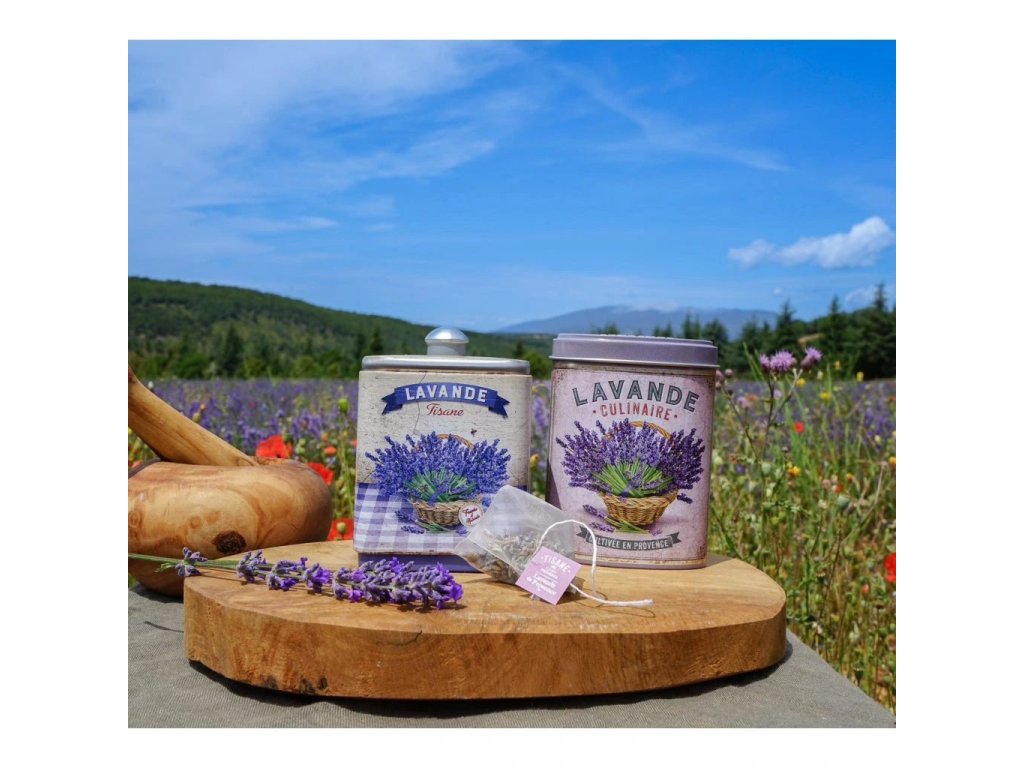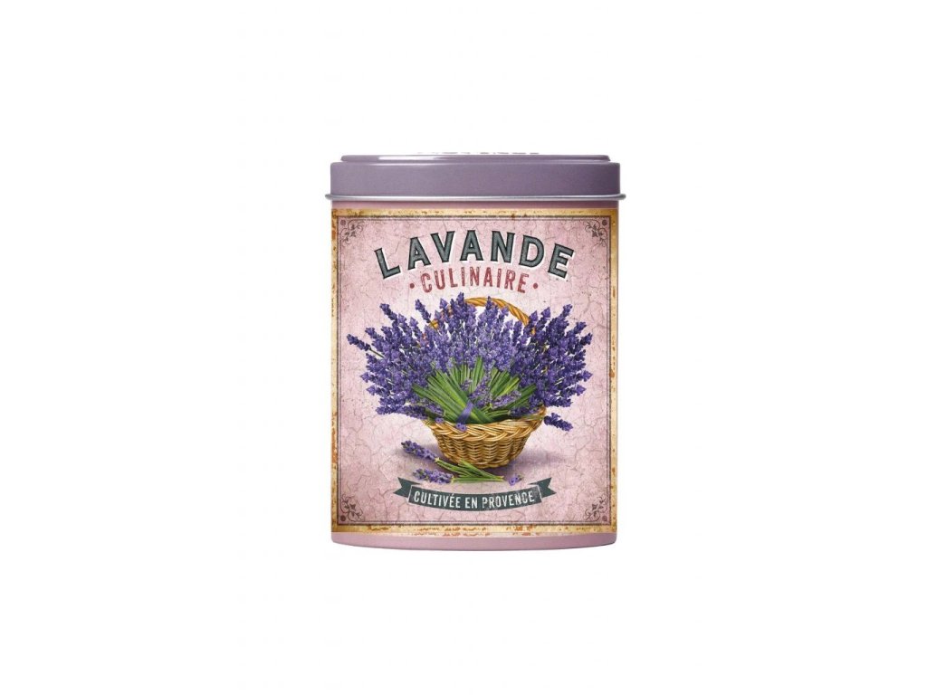 Levandule pro použití v kuchyni vypěstovaná v kraji Provence. Balená v plechové krabičce.
