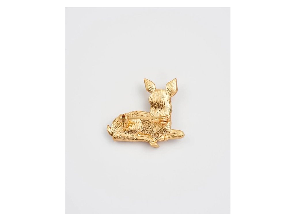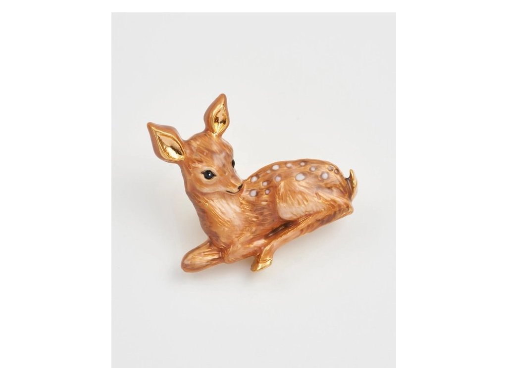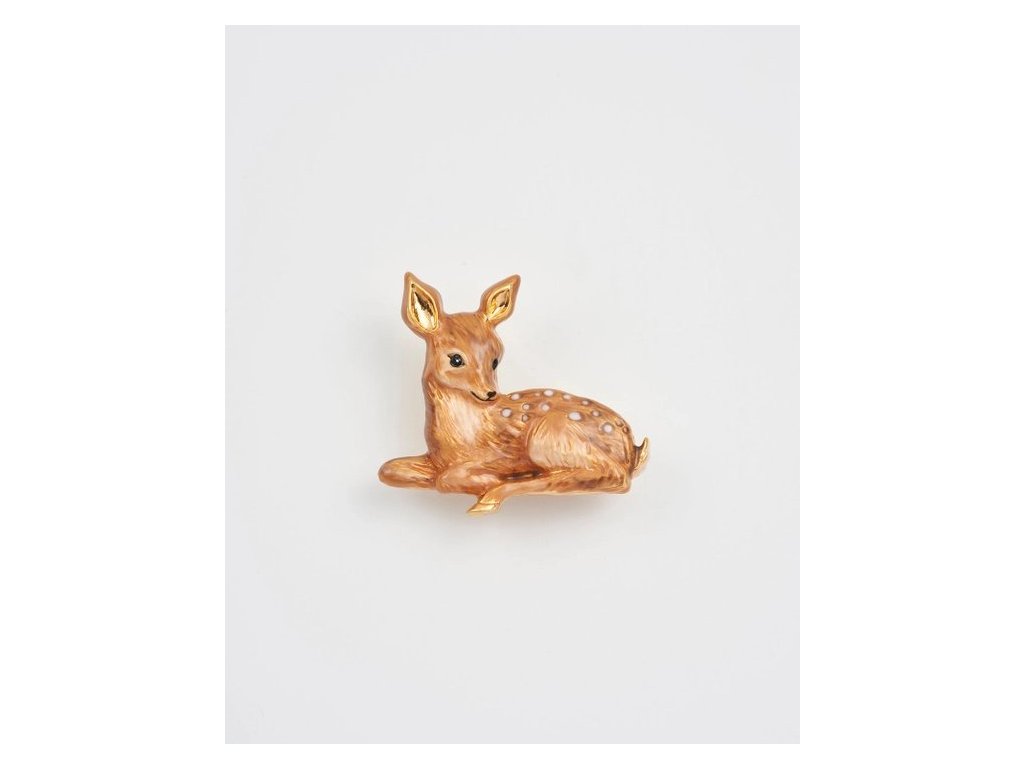 Brož je krásně zpracovaným doplňkem, který oživuje lesní folklór. Tato brož je ideální pro zákazníky, kteří hledají jemné, ale výrazné kousky s duší a nabízí nádech elegance inspirované přírodou, která zkrášlí každý outfit. Ručně malovaná brož z mosazi pozlacené 22 karátovým zlatem zobrazuje odpočívajícího kolouška, který symbolizuje nevinnost, mír a klid. Tato kompaktní, ale nápadná a lehká brož se připíná pomocí bezpečnostního zapínání na klasický, brožový můstek. Smaltovaný povrch dodává šperku výraz, jemnou texturu a barevný kontrast.