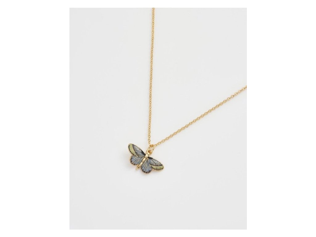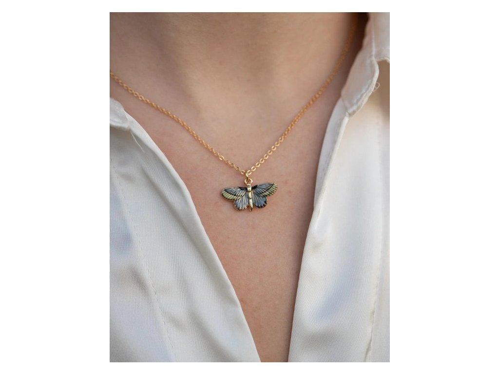 Náhrdelník s přívěskem modrého motýla symbolizující proměny v lidském životě