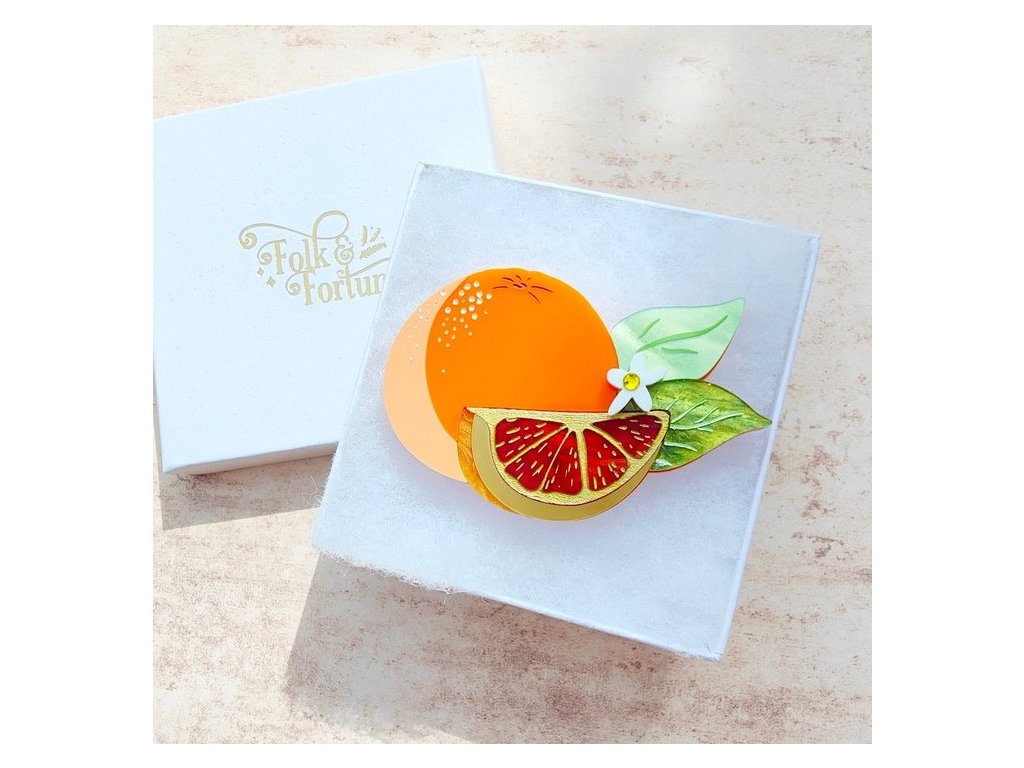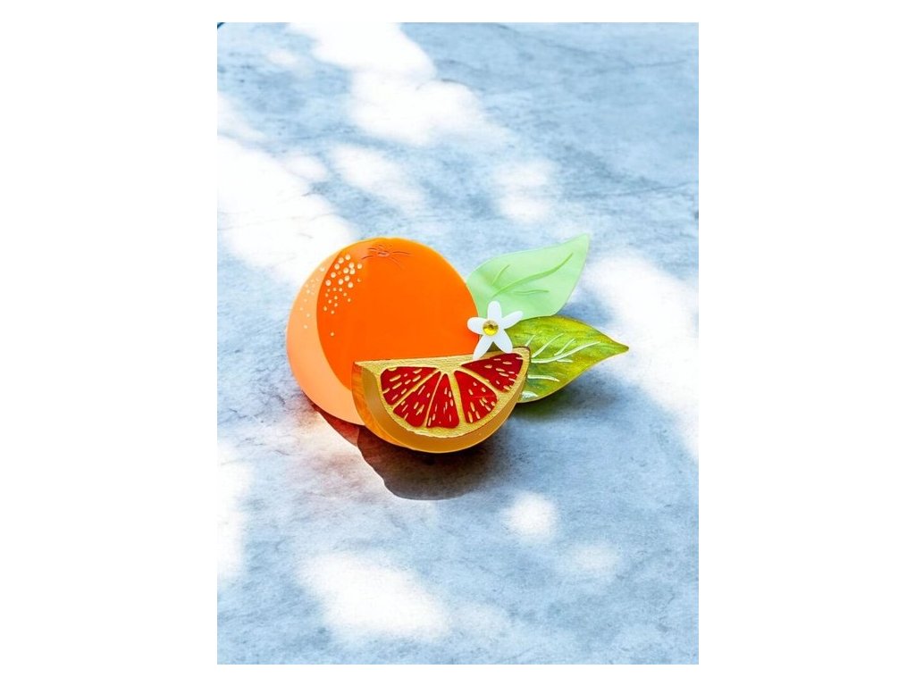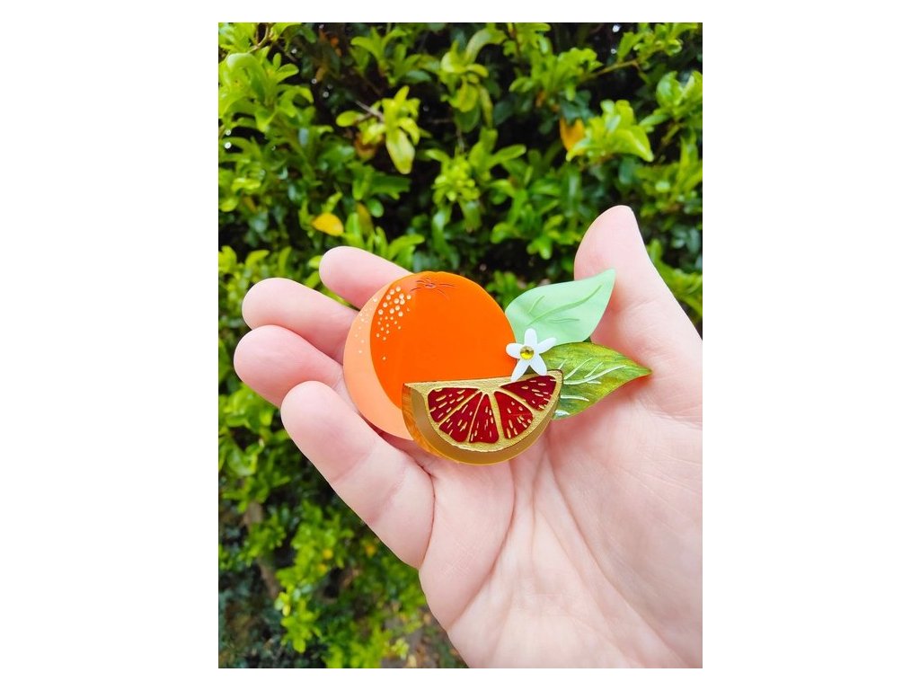 Realisticky provedená brož ve tvaru červených, sicilských pomerančů v krásných, sytých barvách.