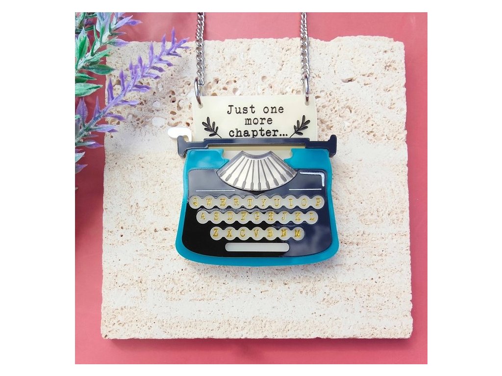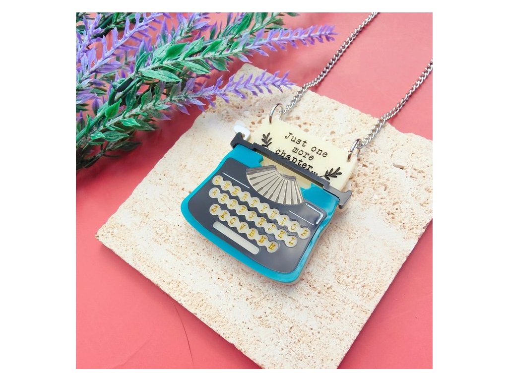 Náhrdelník s krásným, vintage psacím strojem v tyrkysové a béžové barvě o rozměrech 5 x 5 cm. Řetízek je vyroben z nerezové oceli.