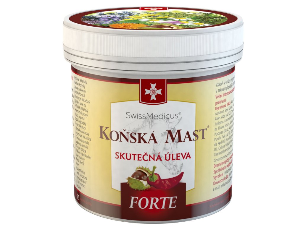Koňská mast® forte hřejivá je unikátní bylinný balzám vyrobený z 25 druhů bylin podle tradiční, generacemi prověřené receptury. Je vhodná k masáži pokožky při namožených zádech a kloubech a pro preventivní prohřátí před fyzickou zátěží. Účinná receptura obsahuje mimo jiné kaštan a kostival.Doplňkové parametry