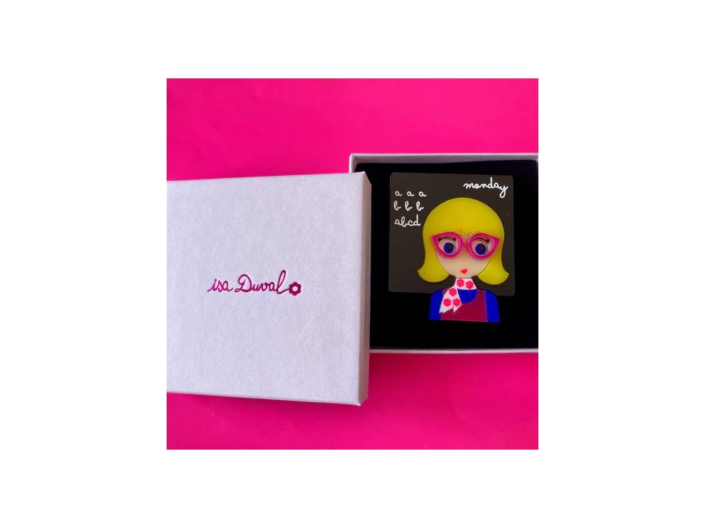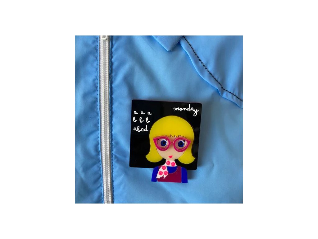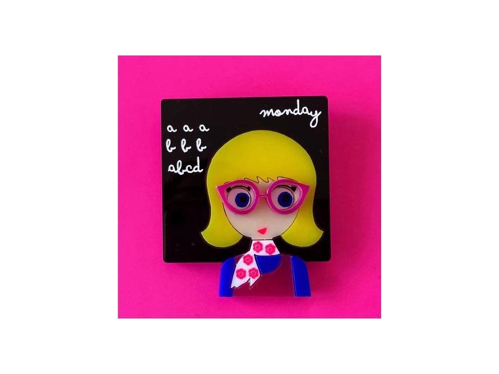 Alison je blondýnka a ráda nosí výrazné brýle, dnes má sytě růžové. Do třídy před tabuli se oblékla do modré, vínové a její elegantní šáteček zdobí růžové květinky. Pojďte se s Alison seznámit! Tato brož krásně oživí Váš outfit, ať už sama stojíte před tabulí nebo máte na školu milé vzpomínky. Má rozměry 6 x 5 cm, tloušťku 6 mm a je ručně vyrobena z akrylové pryskyřice.