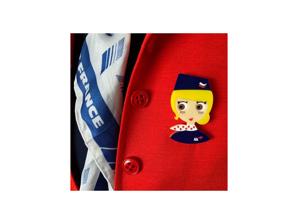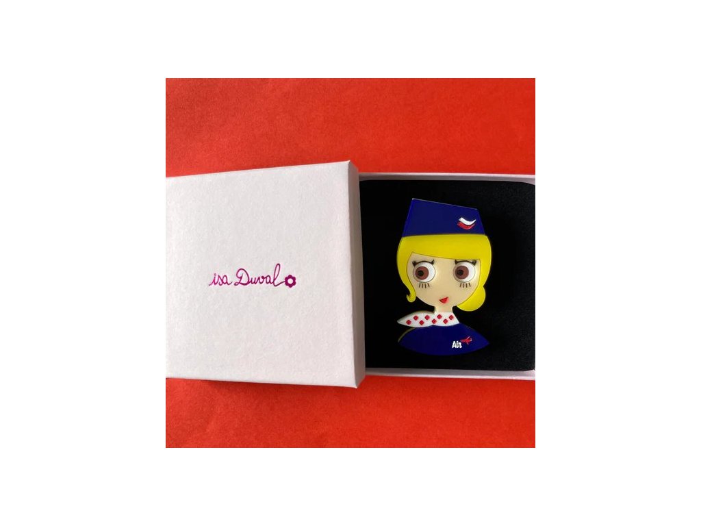 Jemná blondýnka s čokoládově hnědýma očima je vždy upravená a milá, přesně taková, jakou byste na palubě letadla chtěli poznat. Součástí její klasické uniformy je tmavě modrá toka ve tvaru lodičky s bílo červeným emblémem, šáteček s červeným vzorem, nápis Air a odznak letadla na klopě tmavě modrého saka. Všechny detaily jsou gravírované a ručně malované. Brož má rozměry 6 x 4 cm, tloušťku 6 mm a je ručně vyrobena z akrylové pryskyřice.