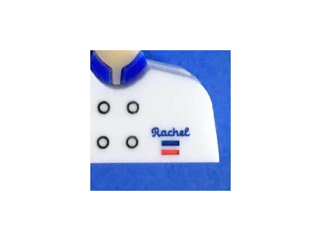 Rachel je modrooká tmavovláska s krátce střiženým mikádem. Rozměry brože jsou 6 x 3,5 cm, tloušťku 6 mm a je ručně vyrobena z akrylové pryskyřice. Detaily brože jsou gravírované, ručně malované a lakované.