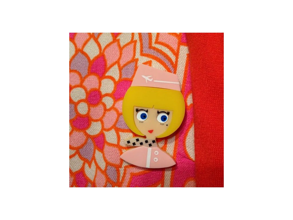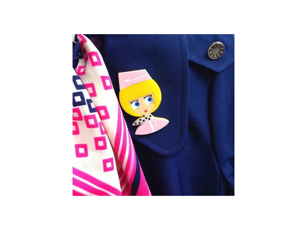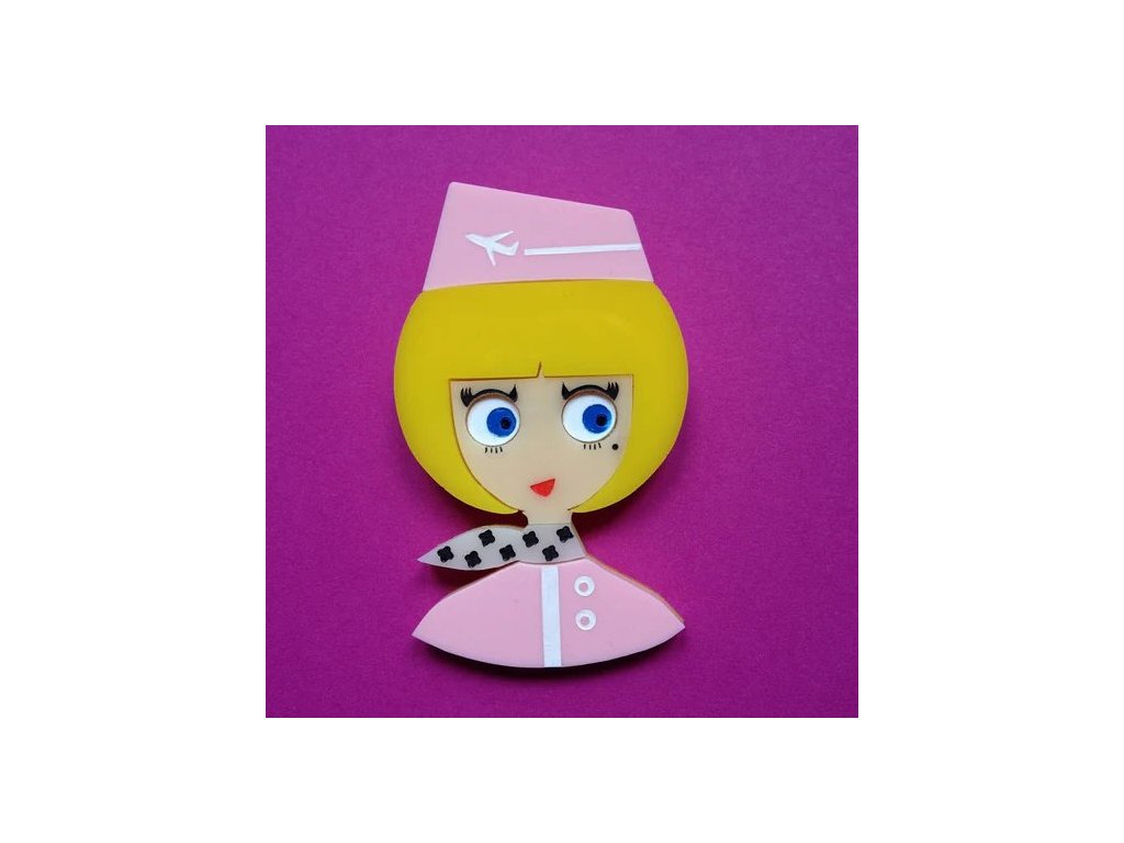 Stella má blond vlasy střižené na krátké mikádo a modré oči. Brož má rozměry 6,5 x 4,5 cm, tloušťku 6 mm a je ručně vyrobena z akrylové pryskyřice. Skvěle doplní Váš kabát, sako nebo kardigan.