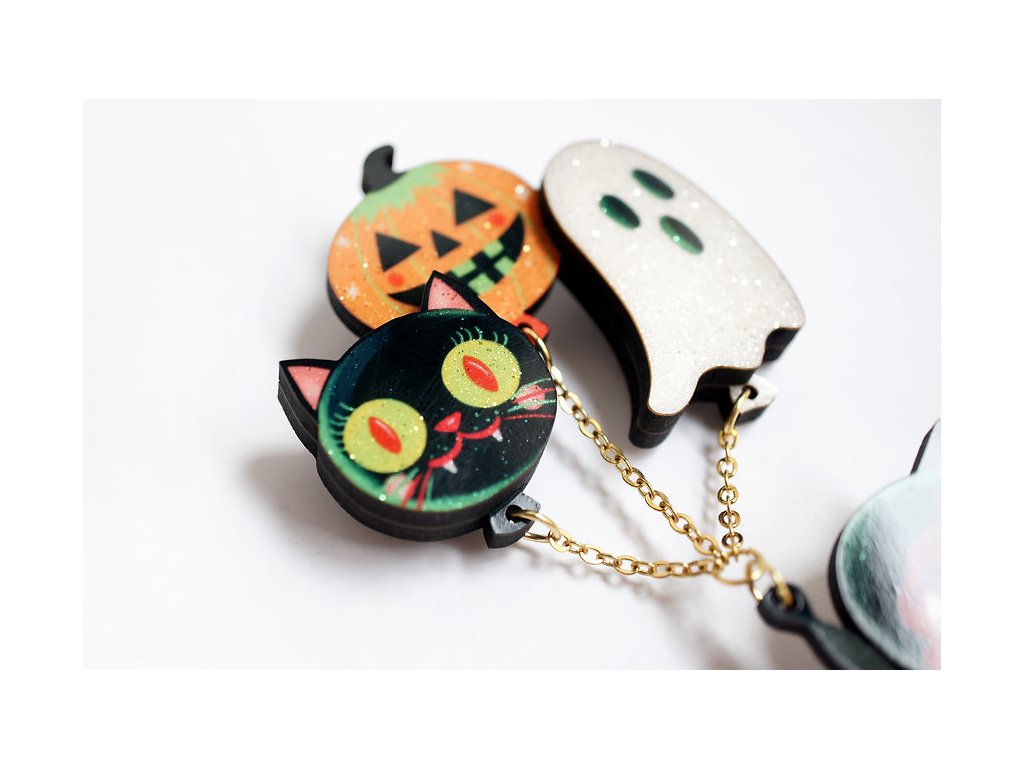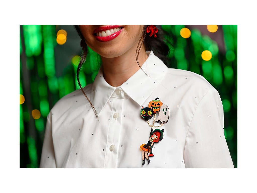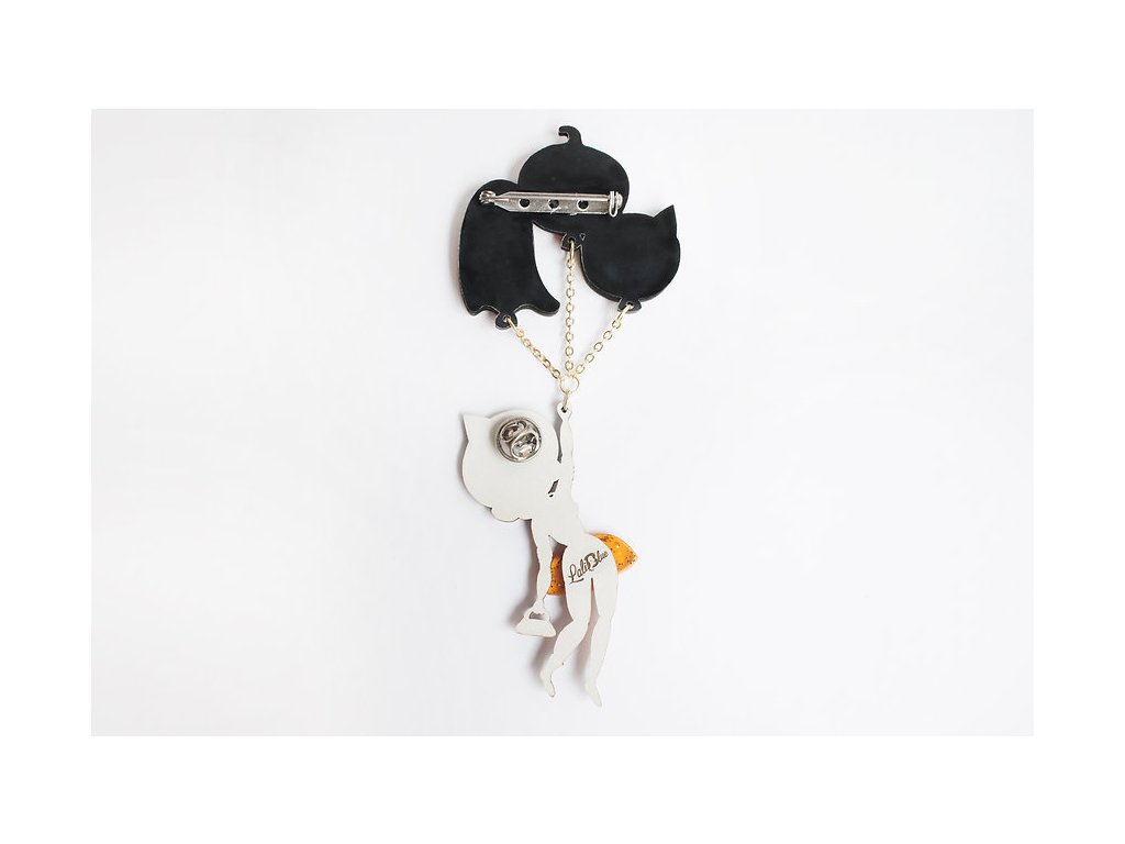 Každý balónek je k čarodějnici připevněn kovovými řetízky, díky kterým vypadá jako by byla v plném letu. Tato brož se skládá ze dvou spojených částí: