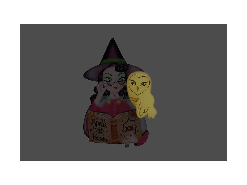 Kouzelná, jemná brož má rozměry brože jsou 7 x 4 cm. Vyrobena z ilustrovaného dřeva s povrchovou úpravou z lesklé akrylátové pryskyřice. Sova je vyrobena z fosforeskující pryskyřice a ve tmě svítí. Zapínání s pojistkou, vyrobené z nerezové oceli.