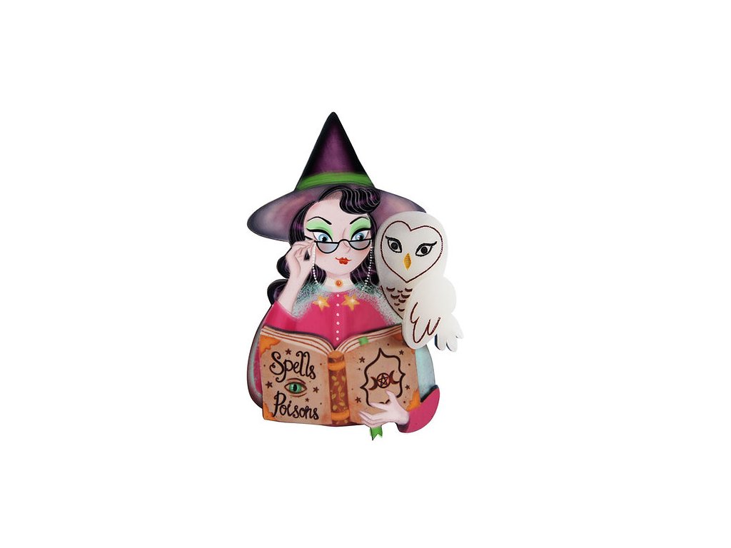 Brož Mladá čarodějka s knihou kouzel a sovou
