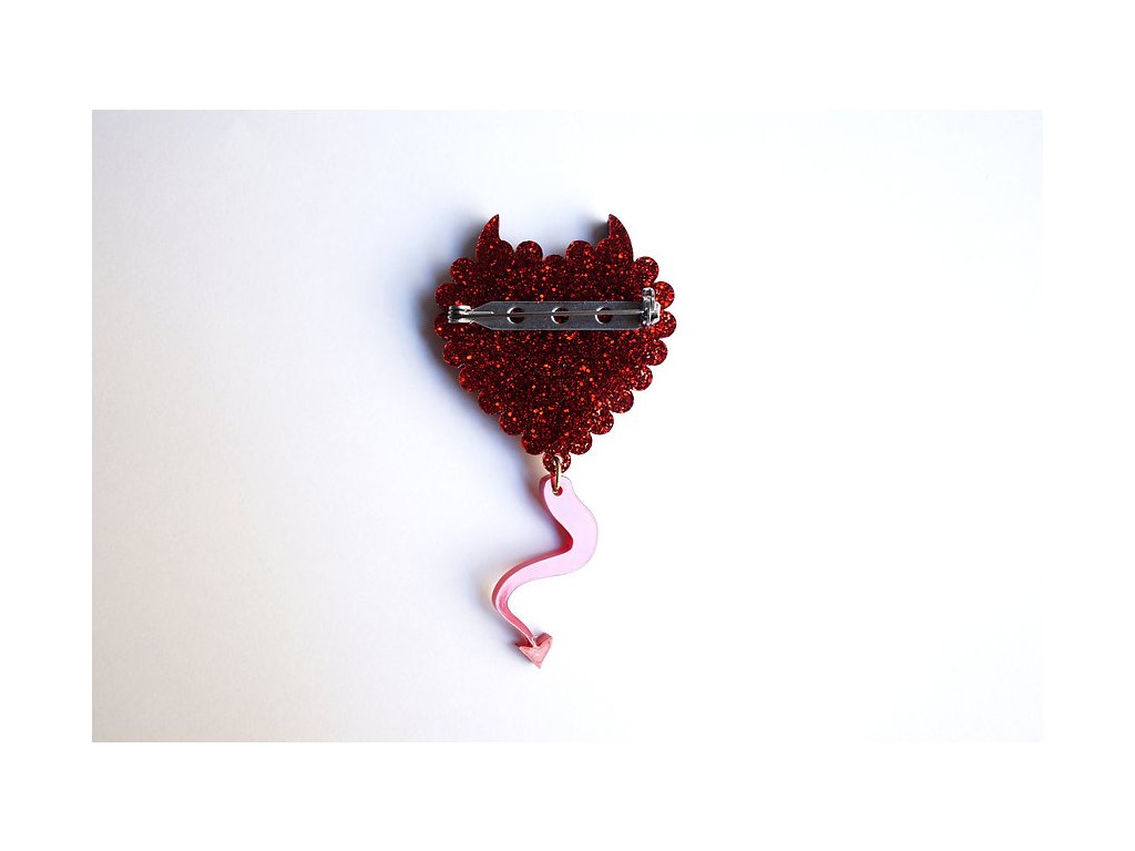 Brož krásné, sytě rudé barvy se třpytkami má rozměry 7 x 4,5 cm, se zapínáním na sponu s pojistkou. Vyrobena sublimační technikou ze dřeva a akrylové pryskyřice. Zapínání z nerezové oceli.
