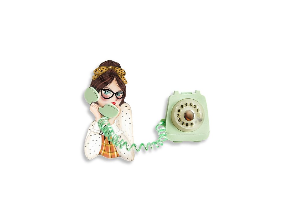 Ach ty dívčí hovory ... 😊 Brož je vyrobena ze dvou částí, každá je připnuta samostatně a spojeny jsou flexibilním kabelem, podobným kabelům retro telefonních přístrojů. Navíc má telefon otočný ciferník, tak je retro iluze dokonalá.