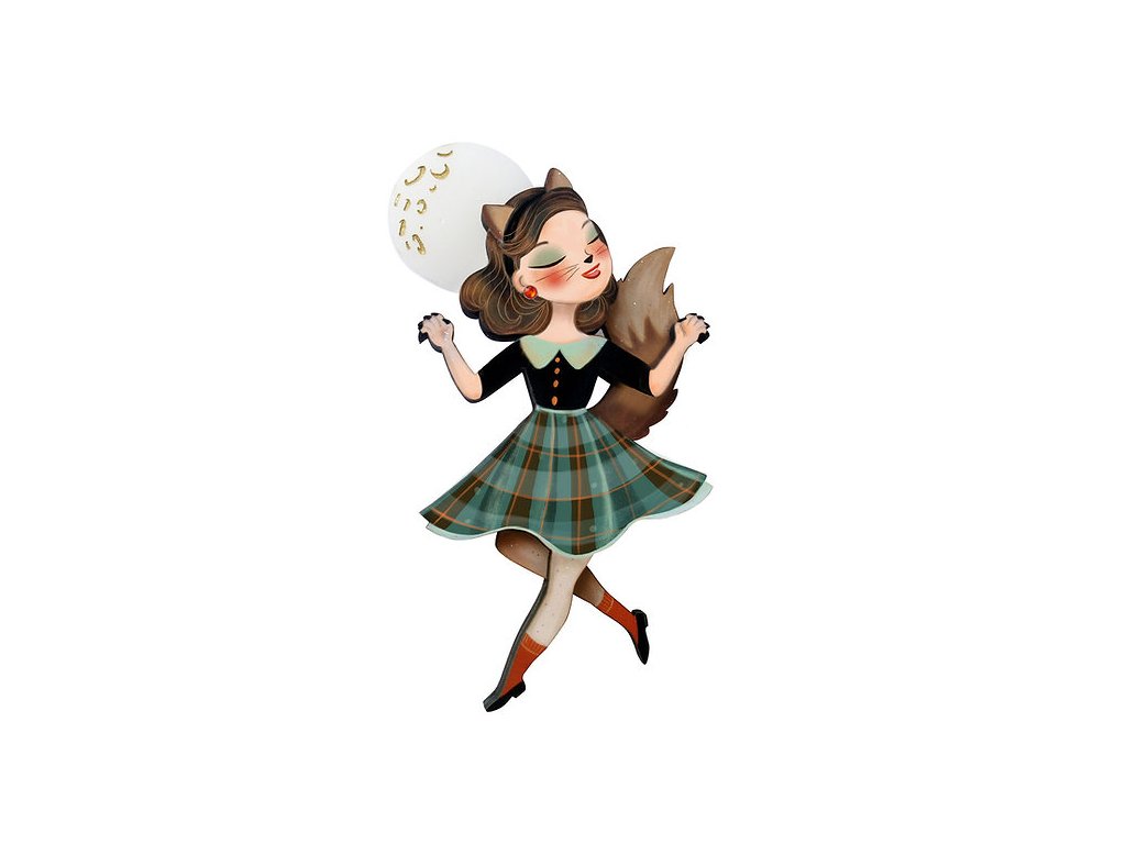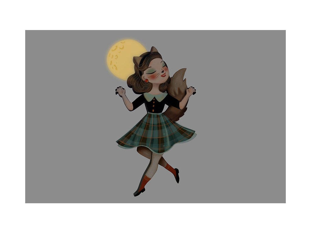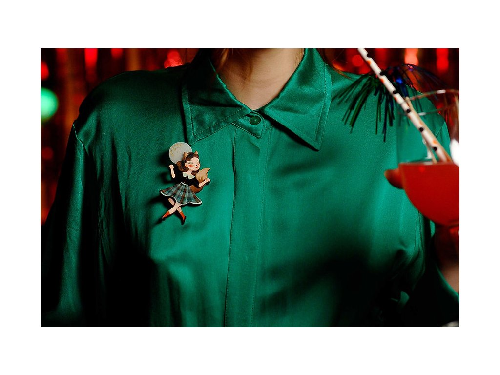 Brož má rozměry 8,5 x 5 cm, se zapínáním na sponu s pojistkou. Vyrobena sublimační technikou ze dřeva a akrylové pryskyřice, doplněná třpytivým, rudým krystalem coby náušnicí v oušku vlkodlačí dívky. Měsíc je vyroben z fosforeskující pryskyřice, která ve tmě září a zdoben drobnou rytinou letícího hejna netopýrů. Zapínání z nerezové oceli.