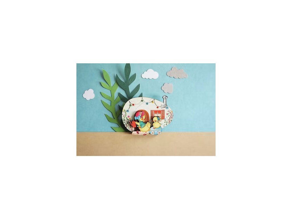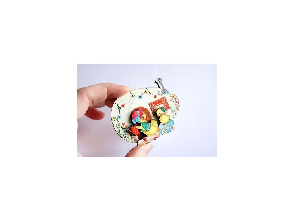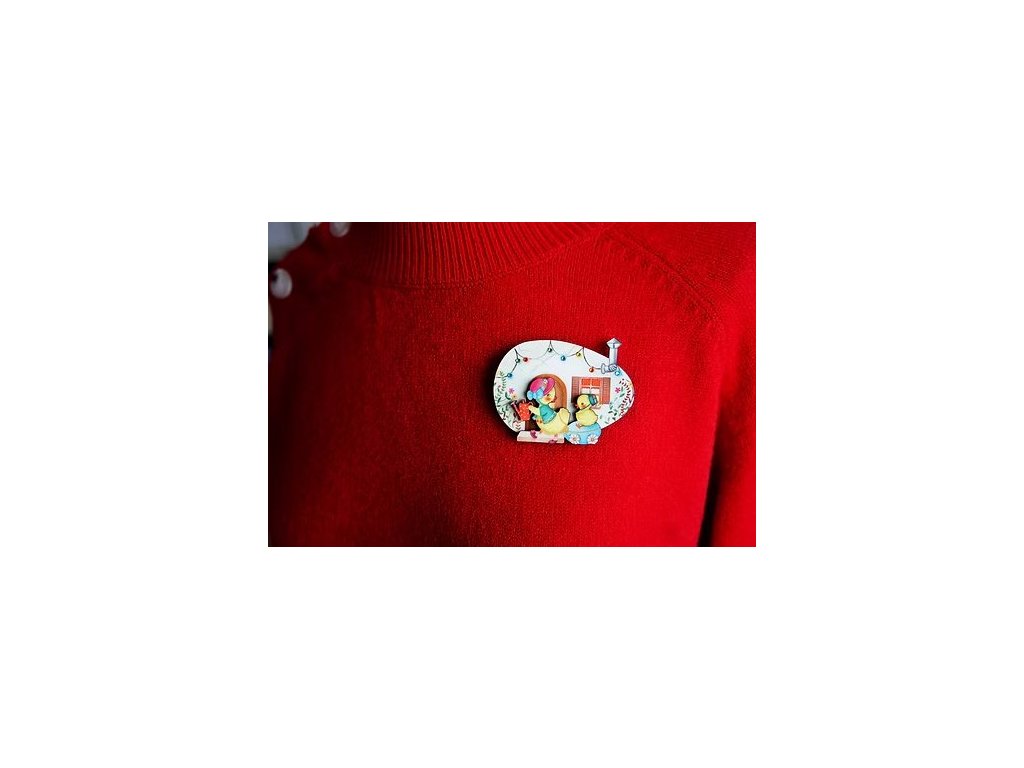 Rozměry brože 6,5 x 5 cm se zapínáním na sponu s pojistkou. Je vyrobena sublimační technikou ze dřeva a akrylové pryskyřice se třpytkami. Kůřítka jsou plastická a vystupují z reliéfu skořápkového domečku, který je ozdoben třpytivými kamínky. Zapínání z nerezové oceli.