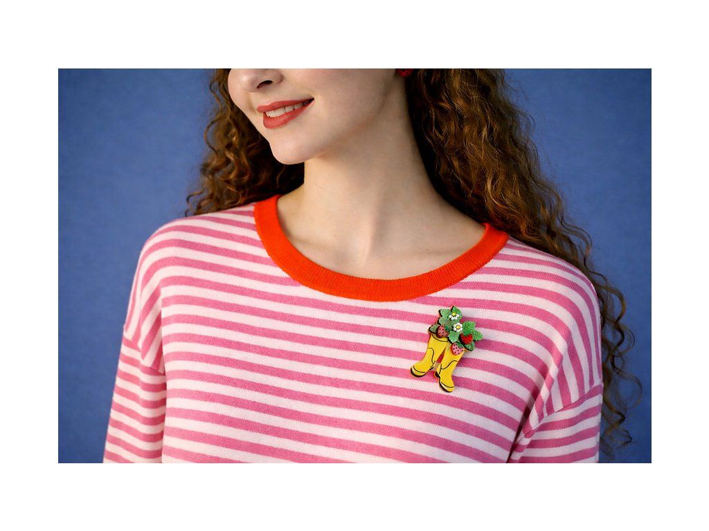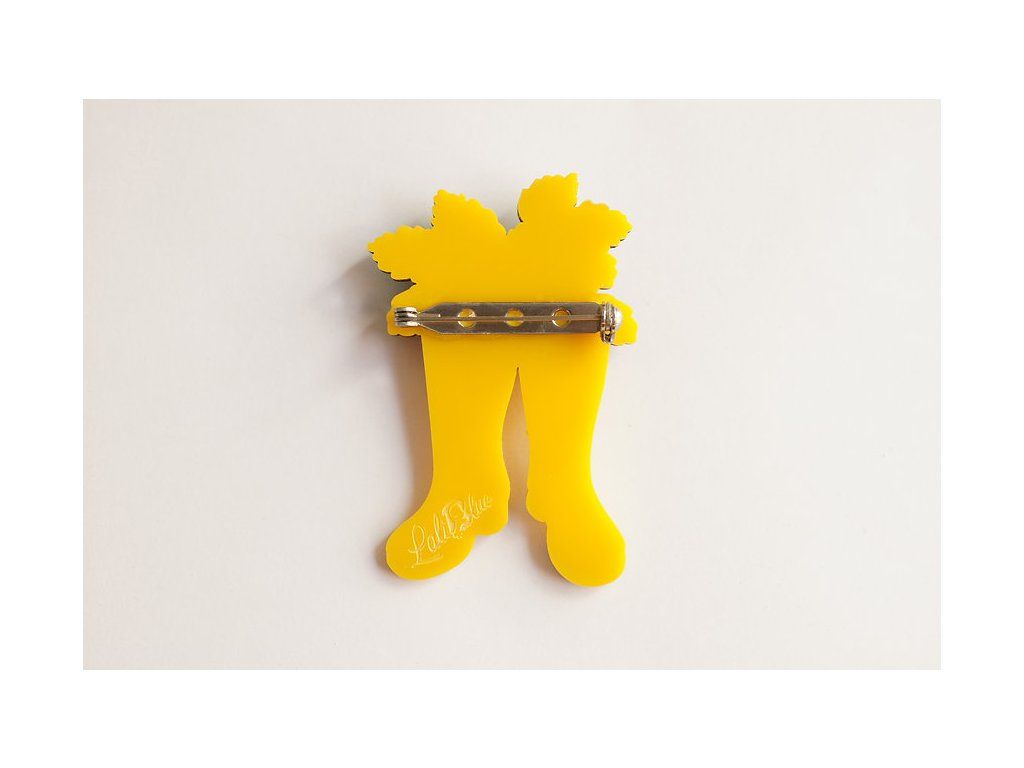 Brož o rozměrech 6,5 x 4 cm je vyrobena ze dřeva sublimační technikou a doplněna akrylem se třpytkami a kamínky. Okvětní lístky jsou vrstveny tak, aby šperku dodaly hloubku. Květináč- holinky je vyrobený ze žlutého akrylu s ručně malovanými detaily. Zapínání na sponu s pojistkou vyrobené z nerezové oceli.