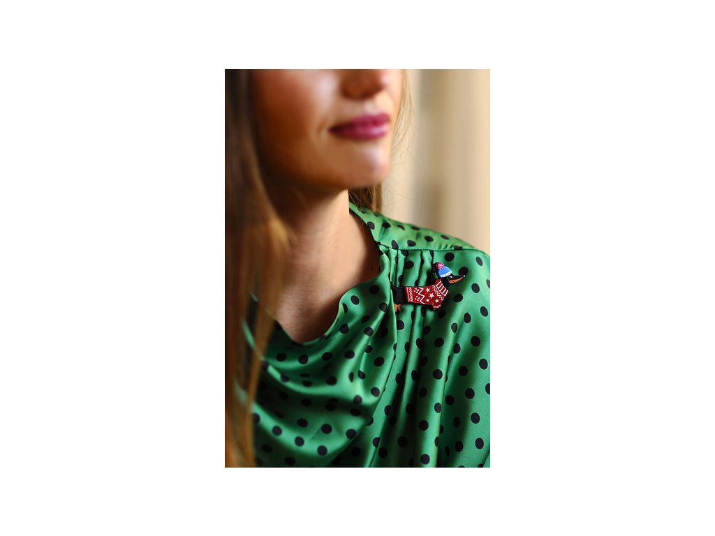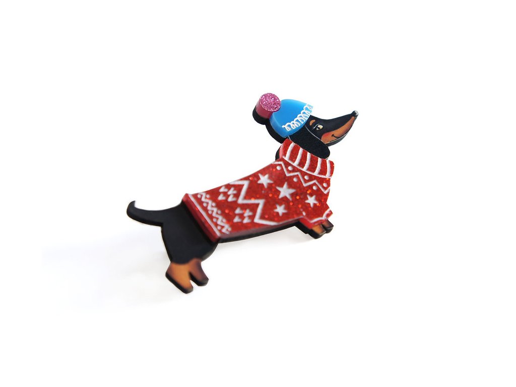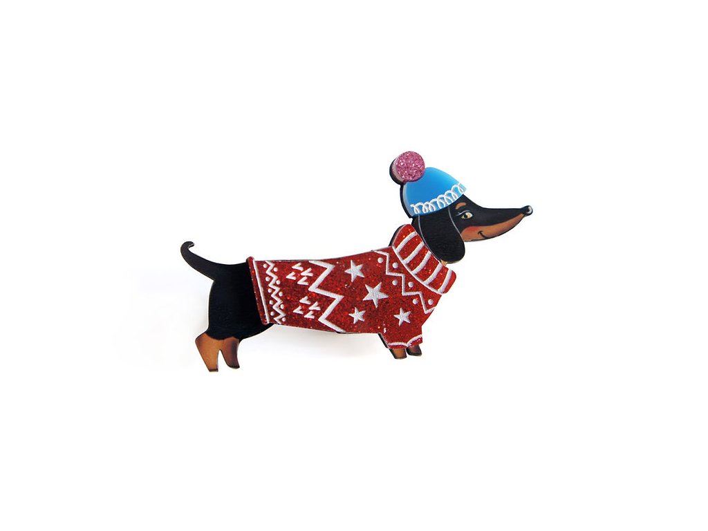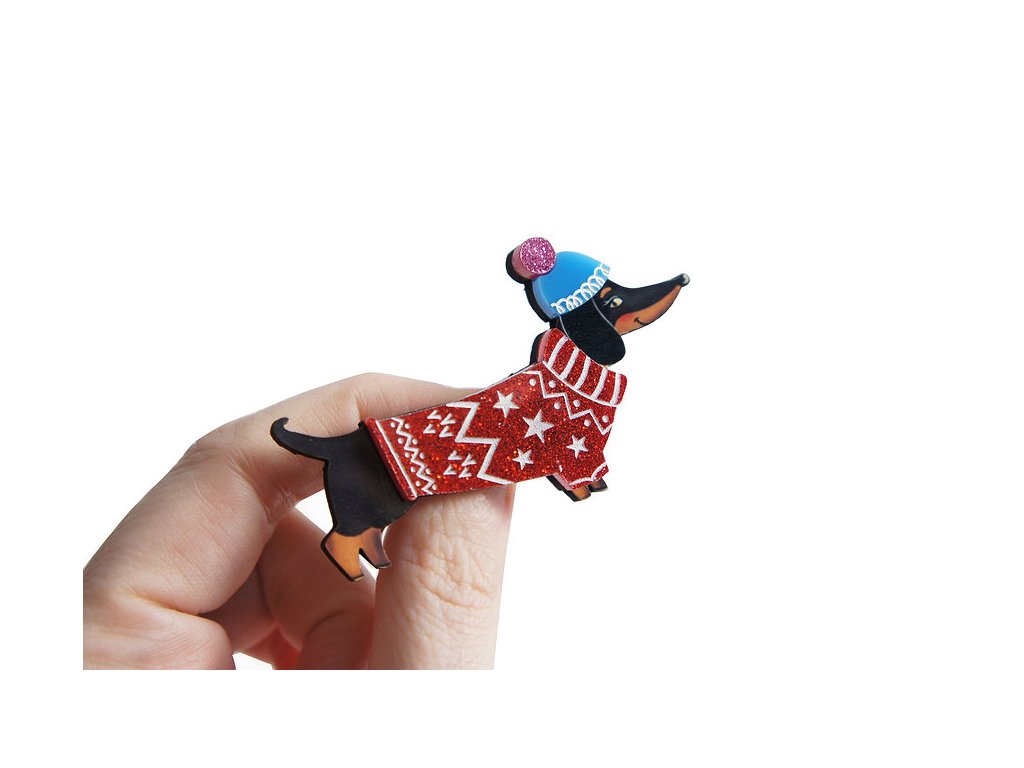 Brož Pejsek jezevčík s čepicí, oblečený ve svetru.