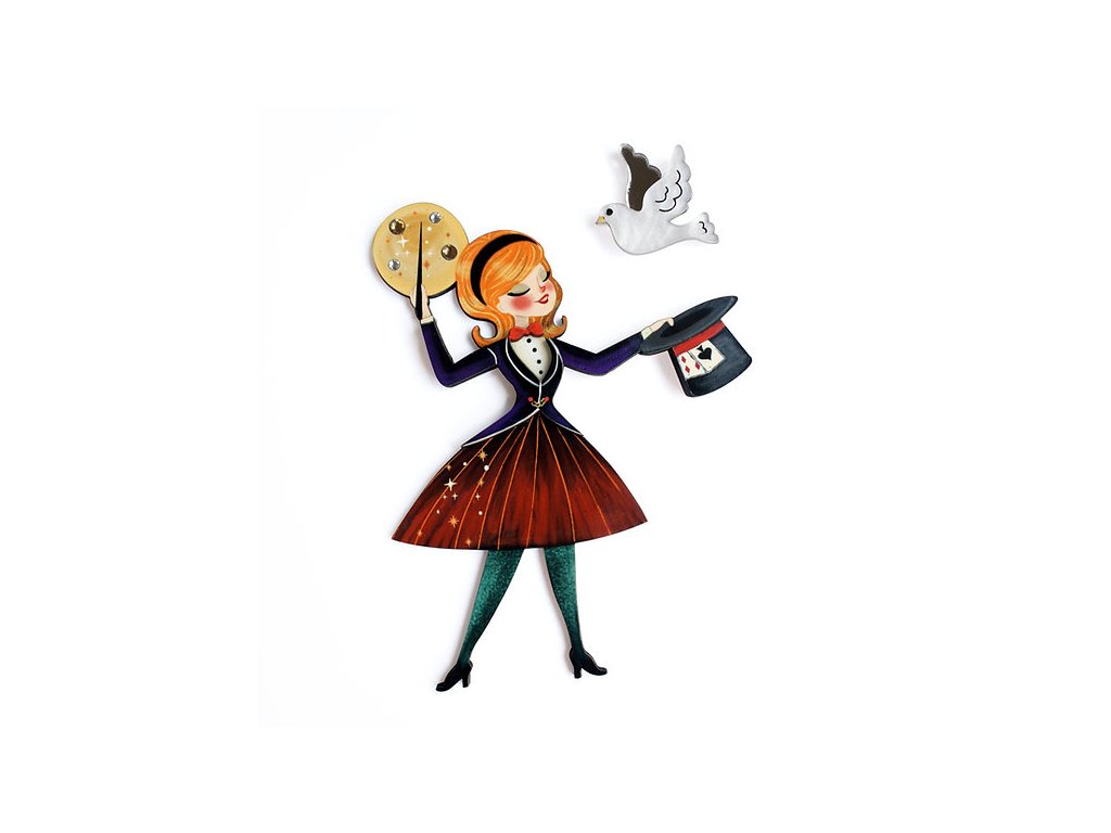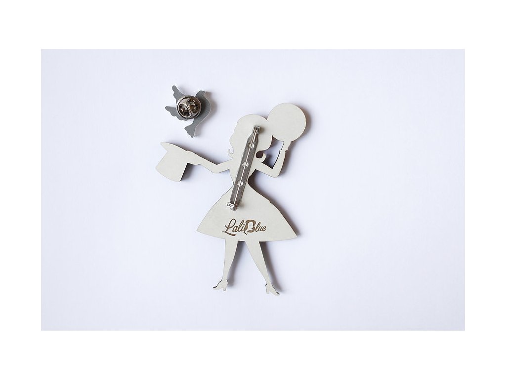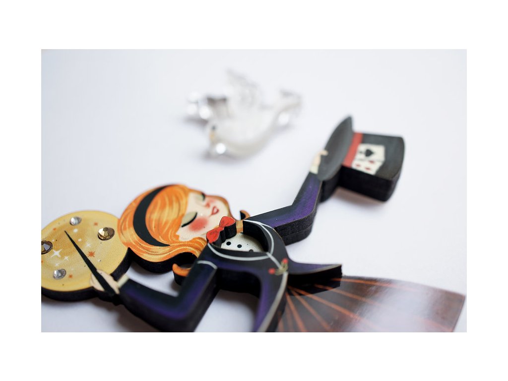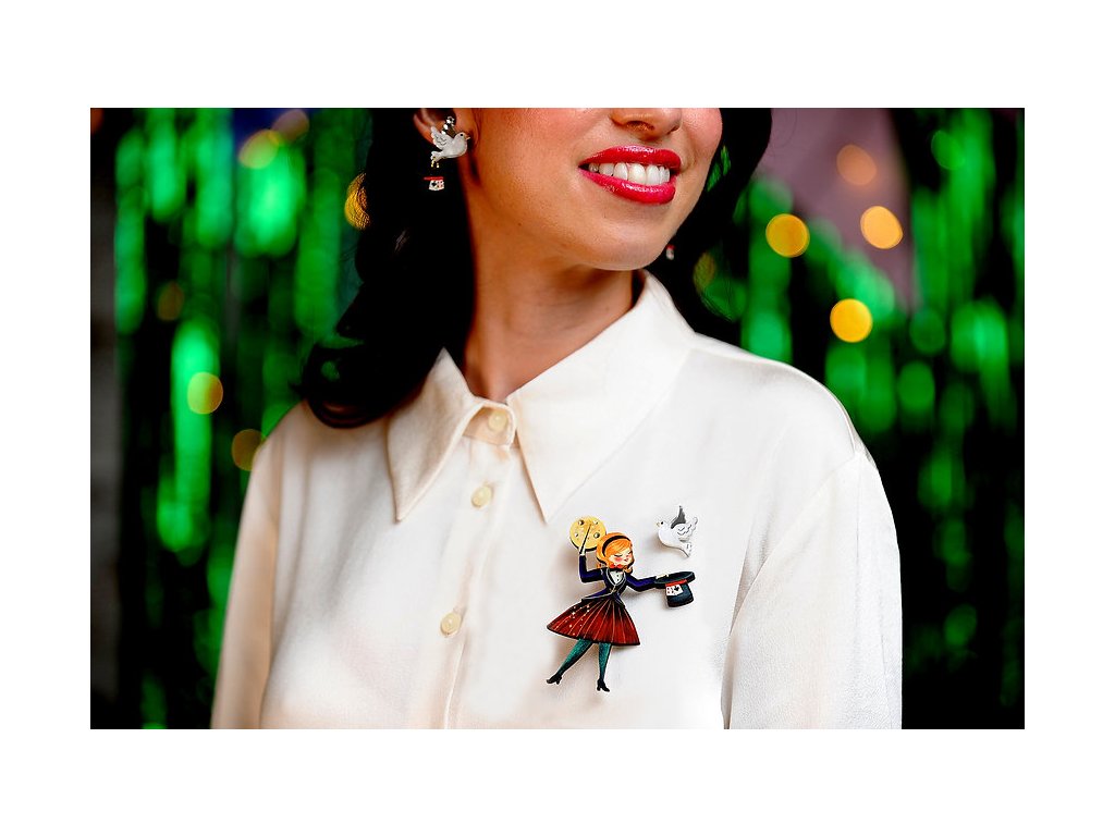Set dvou broží, které lze nosit najednou i zcela samostatně. Kouzelnice je upevněna brožovým zapínáním s pojistkou a holubice se připíná kovovým pinem. Je tedy jen na Vás, zda bude holubice stylově létat nad hlavou kouzelnice nebo unikne ze zajetí. Oba kousky jsou vyrobeny z ilustrovaného dřeva a akrylové pryskyřice, doplněny ozdobami z třpytivých kamínků kolem hůlky.
