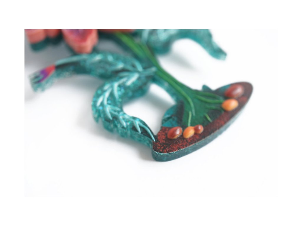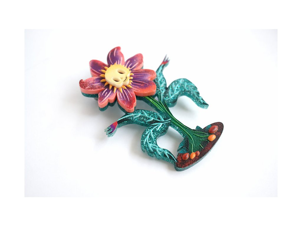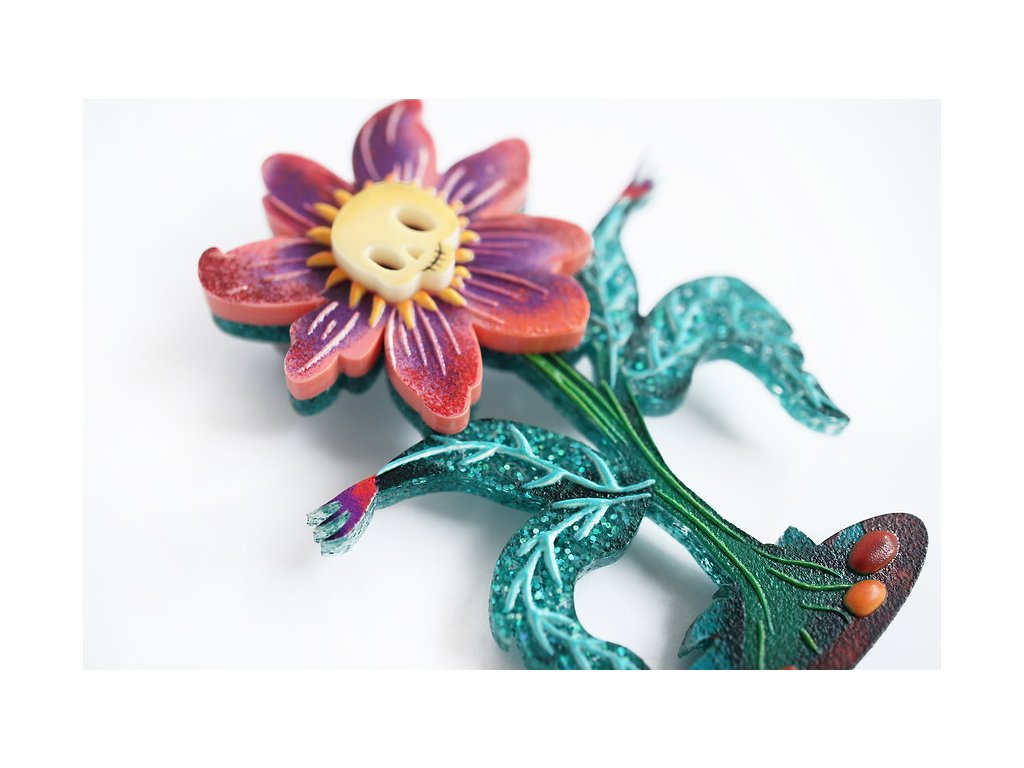 Brož má rozměry 7 x 5 cm, se zapínáním na sponu s pojistkou. Vyrobena z akrylové pryskyřice se třpytkami a krásnými 3D reliéfy na listech a květu, doplněna UV potiskem. Zapínání z nerezové oceli