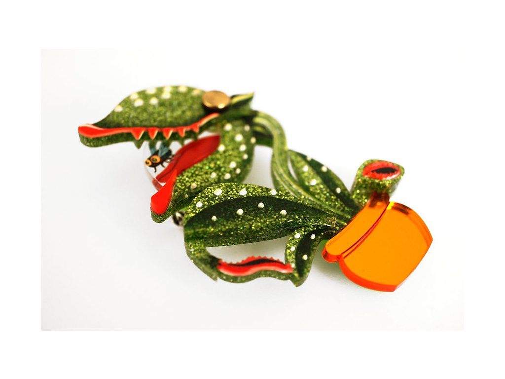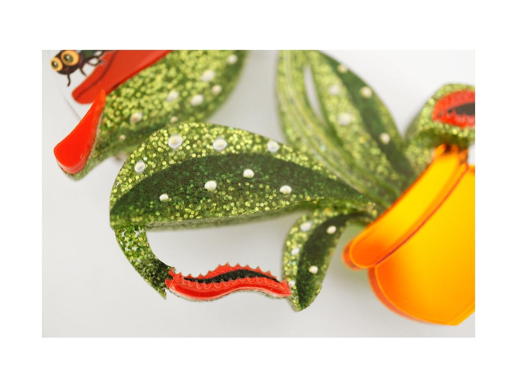 Brož má rozměry 7 x 4,5 cm, se zapínáním na sponu s pojistkou. Vyrobena z akrylové pryskyřice se třpytkami a krásnými 3D reliéfy na listech a květu, doplněna UV potiskem. Zapínání z nerezové oceli