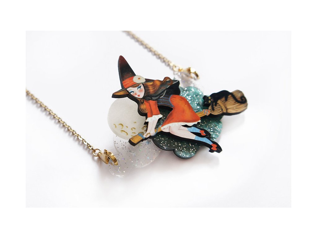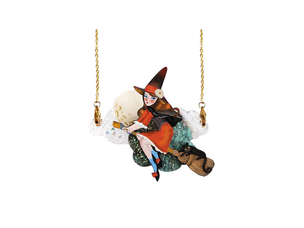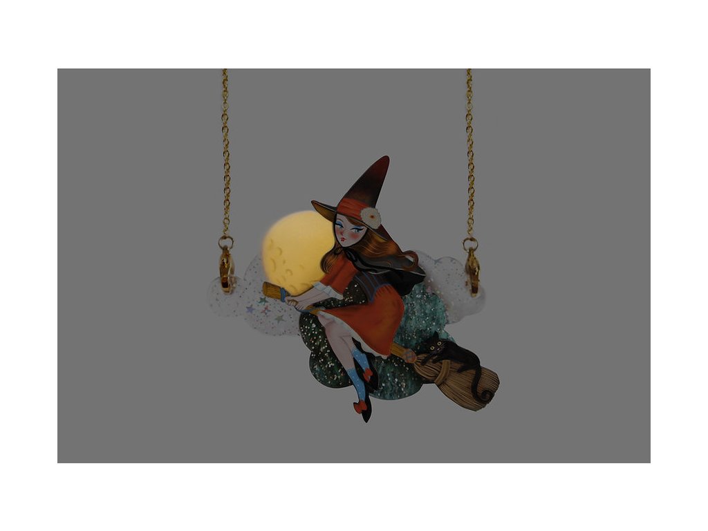 Brož nebo náhrdelník 2 v 1 Čarodějnice s černou kočkou na koštěti
